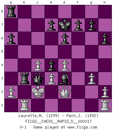 Last move : 0-1 2009 March 23 9:25:8 [Event "FICGS__CHESS__RAPID_D__000017"] [Site "FICGS"] [Date "2009.01.03"] [Round "1"] [White "Leurette,Marc-Antoine"] [Black "Pech,Jaroslav"] [Result "0-1"] [WhiteElo "1299"] [BlackElo "1492"] 1.e4 c5 2.Nc3 Nc6 3.Bc4 e6 4.d3 a6 5.Nf3 b5 6.Bb3 Qc7 7.Qe2 Bb7 8.Bd2 Bd6 9.O-O-O Nge7 10.Bg5 b4 11.Na4 Nd4 12.Nxd4 cxd4 13.f4 h6 14.Bxe7 Bxf4+ 15.Kb1 Kxe7 16.g3 Be3 17.c3 bxc3 18.bxc3 Bc6 19.c4 Rhb8 20.Kc2 Bxa4 21.Bxa4 Qa5 22.Bb3 Rxb3 23.Rb1 Qc3+ 0-1 Sicilian : Closed, 2...Nc6 Queenside Castling by player White (move 9) Player Black won this chess game. Follow this game move after move (download)If your opponent cannot do anything active, then don't rush the position; instead you should let him sit there, suffer, and beg you for a draw. (Jeremy Silman) Wenn Spassky eine Figur opfert kannst du genauso gut aufgeben. Aber wenn Tal eine Figur opfert, spiel weiter. Er könnte noch eine weitere opfern, und dann ... wer weiß? (Miguel Najdorf) Nunca antes ha habido un jugador de Ajedrez con tal conocimiento a fondo de las complejidades del juego y una inmensa voluntad absolutamente indomable de ganar. Yo pienso que Fischer es el jugador mas grande que jamás haya existido. (Lisa Lane) J'apprécie les joueurs d'est-indienne, c'est grâce à eux que je nourris ma famille depuis tant d'années. (Petrosian) If you don't practice you don't deserve to win. (Andre Agassi)