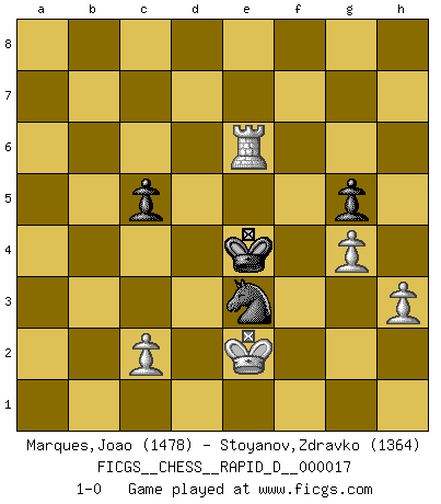 Last move : 1-0 2009 February 12 19:15:54 [Event "FICGS__CHESS__RAPID_D__000017"] [Site "FICGS"] [Date "2009.01.03"] [Round "1"] [White "Marques,Joao"] [Black "Stoyanov,Zdravko"] [Result "1-0"] [WhiteElo "1478"] [BlackElo "1364"] 1.e4 e5 2.Nf3 d6 3.d4 Bg4 4.dxe5 Bxf3 5.Qxf3 dxe5 6.Bc4 Qf6 7.Qxf6 Nxf6 8.O-O Bc5 9.Nc3 a6 10.Bg5 Nbd7 11.a3 h6 12.Bh4 O-O 13.Rad1 b5 14.Bb3 Bd4 15.Kh1 c6 16.f4 Bxc3 17.bxc3 Ra7 18.Rde1 Re8 19.fxe5 Rxe5 20.Bg3 Rxe4 21.Rxe4 Nxe4 22.Rxf7 Kh7 23.Be5 Nxe5 24.Rxa7 Nxc3 25.Rxa6 Ng4 26.h3 Ne5 27.a4 bxa4 28.Bxa4 Nxa4 29.Rxa4 Kg6 30.Kg1 Kf5 31.Kf2 g5 32.g4+ Ke6 33.Ke3 Kd5 34.Ra5+ c5 35.Ra6 Nf7 36.Rf6 Nd6 37.Rxh6 Nc4+ 38.Ke2 Ke4 39.Rg6 Ne3 40.Re6+ 1-0 Philidor's defense Kingside Castling by player White (move 8) Kingside Castling by player Black (move 12) 10 pieces endgame at move 29 : White KRPPP , Black KNPPP WHITE : King + 1 Rook 3 Pawns BLACK : King + 1 Knight 3 Pawns 9 pieces endgame at move 37 : White KRPPP , Black KNPP WHITE : King + 1 Rook 3 Pawns BLACK : King + 1 Knight 2 Pawns Player White won this chess game. Follow this game move after move (download)Capture of the adverse King is the ultimate but not the first object of the game. (William Steinitz) Schach ist Krieg, im Schach geht es um testosterongesteuerte Urschreie. (Garry Kasparov) El Ajedrez es sobre todo, ¡una pelea!. (Emanuel Lasker) Les Echecs sont affaire de jugement sensible. Savoir quand frapper et quand esquiver. (Fischer) God is an atheist. (Unknown)