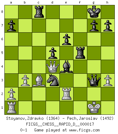 Last move : 0-1 2009 March 29 8:46:11 [Event "FICGS__CHESS__RAPID_D__000017"] [Site "FICGS"] [Date "2009.01.03"] [Round "1"] [White "Stoyanov,Zdravko"] [Black "Pech,Jaroslav"] [Result "0-1"] [WhiteElo "1364"] [BlackElo "1492"] 1.e4 c5 2.Nf3 d6 3.h3 Nf6 4.c3 Nc6 5.Bb5 Nxe4 6.Bxc6+ bxc6 7.O-O c4 8.Re1 d5 9.Ne5 Bf5 10.Qf3 e6 11.Nxc6 Qb6 12.Nd4 Bc5 13.Re2 Bxd4 14.cxd4 O-O 15.d3 cxd3 16.Qxd3 Nxf2 17.Qd2 Nd3 18.Na3 Qxd4+ 19.Qe3 Qa4 20.b3 Qa6 21.Bd2 Qxa3 22.g4 Be4 23.Bc3 Rac8 24.Bd2 f5 25.gxf5 Rxf5 26.Qd4 Qd6 27.Bc3 Qg3+ 0-1 Sicilian Kingside Castling by player White (move 7) Kingside Castling by player Black (move 14) Player Black won this chess game. Follow this game move after move (download)The Chess pieces are the block alphabet which shapes thoughts; and these thoughts, although making a visual design on the chessboard, express their beauty abstractly, like a poem. (Marcel Duchamp) Mein Gehirn das ist mein zweitwichtigstes Organ [Aus dem Film: Der Schläfer]. (Woody Allen) No nos podemos resistir a la fascinación de un sacrificio ya que la pasión por los sacrificios es parte de la naturaleza de un jugador de Ajedrez. (Rudolf Spielman) Les échecs, c'est la lutte contre l'erreur. (Johannes Zukertort) The Movers & Shakers of this world are those who play chess in the mornings and go to the disco in the evenings. (Dinesh De Silva)