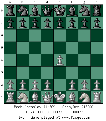 Last move : 1-0 2009 February 12 21:5:22 [Event "FICGS__CHESS__CLASS_E__000099"] [Site "FICGS"] [Date "2009.01.03"] [Round "1"] [White "Pech,Jaroslav"] [Black "Chen,Des"] [Result "1-0"] [WhiteElo "1492"] [BlackElo "1600"] 1.e4 1-0 This chess game has been lost on time (started : 2009.01.03 0:12:54) King's pawn Opening Player White won this chess game. Follow this game move after move (download)The only thing Chess players have in common is Chess. (Lodewijk Prins) Frage: Wie viele Autos haben Sie schon zerstört? - Antwort: Nur zwei. (Loek van Wely) Repentinamente, me resultaba obvio en mi analisis que yo había pasado por alto lo que Fischer había visto en el tablero con la mas grande facilidad. (Mikhail Botvinnik) Soyez une menace à chaque fois que vous vous asseyez pour jouer. (Ken Smith) Chess, like love, like music, has the power to make people happy. (Siegbert Tarrasch)