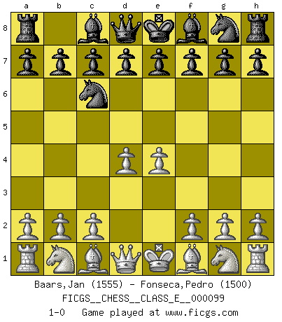 Last move : 1-0 2009 February 13 9:6:54 [Event "FICGS__CHESS__CLASS_E__000099"] [Site "FICGS"] [Date "2009.01.03"] [Round "1"] [White "Baars,Jan"] [Black "Fonseca,Pedro"] [Result "1-0"] [WhiteElo "1555"] [BlackElo "1500"] 1.e4 Nc6 2.d4 1-0 This chess game has been lost on time (started : 2009.01.03 0:12:54) KP : Nimzovich defense Player White won this chess game. Follow this game move after move (download)Chess is above all, a fight ! (Emanuel Lasker) Bis zum Jahr 1971 verlief in meiner Schachkariere alles glatt. Dieses dramatische Match [Fischer-Taimanov 6:0] machte mein Leben zur Hölle. (Mark Taimanov) Hasta este punto, las blancas han seguido un análisis bien conocido. Pero ahora el hace un error fatal: empieza a usar su propia cabeza. (Siegbert Tarrasch) Votre seul travail dans les ouvertures est d'obtenir un milieu de partie jouable. (Lajos Portish) Mac users swear by their computers. PC users swear at their computers. (Author unknown)