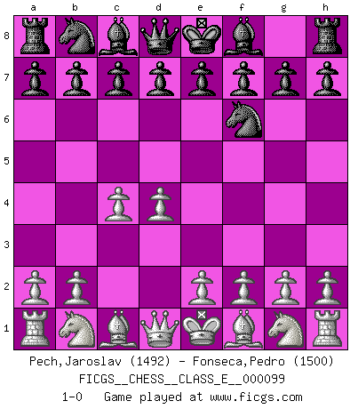 Last move : 1-0 2009 February 12 21:5:22 [Event "FICGS__CHESS__CLASS_E__000099"] [Site "FICGS"] [Date "2009.01.03"] [Round "1"] [White "Pech,Jaroslav"] [Black "Fonseca,Pedro"] [Result "1-0"] [WhiteElo "1492"] [BlackElo "1500"] 1.d4 Nf6 2.c4 1-0 This chess game has been lost on time (started : 2009.01.03 0:12:54) Queen's pawn game Player White won this chess game. Follow this game move after move (download)Kasparov : J'adoube , Ivanchuk : S'il vous plaît ! (Garry Kasparov & Vassily Ivanchuk, Linares 1997) Schach ist mein Leben, meine Leidenschaft, was ich gelernt habe und seit meinem 14. Lebensjahr profimässig praktiziere. Darauf zu verzichten, würde mir sehr schwer fallen. (Viktor Kortschnoi) Cuando le juegas a Fischer, no es una cuestion de si vas a ganar o perder. Es una cuestion de si vas a sobrevivir. (Boris Spassky) Les échecs c'est le défi de l'alpiniste, toujours plus haut, prêt à tout pour monter à l'assaut du Roi ennemi. Les échecs, c'est de la musique en mouvement, un ballet majestueux pour les yeux. C'est de la poésie composée par les fantômes du passé qui au même titre que Rimbaud ou Verlaine méritent notre admiration. Les échecs, c'est de la peinture ou le moindre mouvement modifie le tableau pour en faire un Picasso ou un Van Gogh. Les échecs, c'est tout et rien, c'est la vie et la mort. Jjulie33 sur le forum de France-Echecs. Optimism is a variety of information deficit. Sometimes especially true for correspondence chess games. (Michael Aigner)