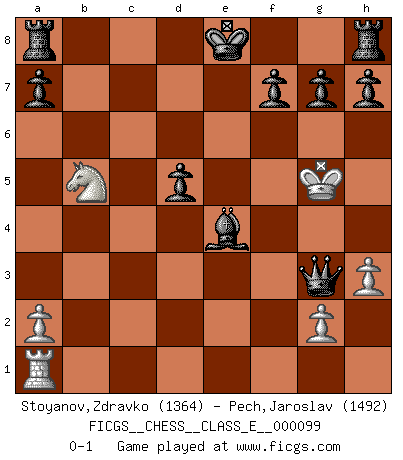 Last move : 0-1 2009 June 5 16:44:58 [Event "FICGS__CHESS__CLASS_E__000099"] [Site "FICGS"] [Date "2009.01.03"] [Round "1"] [White "Stoyanov,Zdravko"] [Black "Pech,Jaroslav"] [Result "0-1"] [WhiteElo "1364"] [BlackElo "1492"] 1.e4 c5 2.Nf3 d6 3.h3 Nc6 4.c3 Nf6 5.Bb5 Nxe4 6.Bxc6+ bxc6 7.O-O c4 8.Re1 d5 9.Ne5 Bf5 10.Nxc6 Qb6 11.Nd4 e5 12.Re2 exd4 13.cxd4 Qxd4 14.Kh1 Qxf2 15.Nc3 Qd4 16.Nb5 Qe5 17.Kg1 Bc5+ 18.d4 cxd3 19.Re3 d2 20.Bxd2 Nxd2 21.Qxd2 Bxe3+ 22.Qf2 Bxf2+ 23.Kxf2 Qxb2+ 24.Kf3 Be4+ 25.Kf4 Qf2+ 26.Kg5 Qg3+ 0-1 Sicilian Kingside Castling by player White (move 7) Player Black won this chess game. Follow this game move after move (download)The Pin is mightier than the sword. (Fred Reinfeld) Schach ist das schnellste Spiel der Welt, weil man in jeder Sekunde Tausende von Gedanken ordnen muß. (Albert Einstein) La caracteristica mas importante en la posición del Ajedrez es la actividad de las piezas. Esto es absolutamente fundamental en todas las fases del juego: Apertura, Juego Medio y especialmente Finales. La limitación primordial en la actividad de una pieza, es la estructuración de los Peones. (Michael Stean) Il n'y a pas de prix trop élevé au scalp de l'ennemi. (Koblentz) Art is the triumph over chaos. (John Cheever)