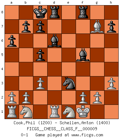 Last move : 0-1 2006 September 29 12:7:29 [Event "FICGS__CHESS__CLASS_F__000009"] [Site "FICGS"] [Date "2006.08.23"] [Round "1"] [White "Cook,Phil"] [Black "Schellen,Anton"] [Result "0-1"] [WhiteElo "1200"] [BlackElo "1400"] 1.e4 e5 2.Nf3 Nc6 3.Bb5 a6 4.Bxc6 dxc6 5.h3 Bc5 6.c3 Qd3 7.Qe2 Qxe2+ 8.Kxe2 f5 9.Nxe5 fxe4 10.d3 exd3+ 11.Nxd3 Bd6 12.Re1 Bf5 13.Kf1 Ne7 14.Rd1 O-O-O 15.Ne1 Rhf8 16.Be3 Nd5 17.Bd4 c5 18.Bxg7 Ne3+ 0-1 Ruy Lopez : Exchange variation Queenside Castling by player Black (move 14) Player Black won this chess game. Follow this game move after move (download)Excellence at Chess is one mark of a scheming mind. (Sir Arthur Conan Doyle) Jeder Fehler erscheint unglaublich dumm, wenn andre ihn begehen. (Georg Christoph Lichtenberg) El sobresalir en el Ajedrez es un signo de una mente intrigante. (Sir Arthur Conan Doyle) L'attaque fait le spectacle, la défense gagne les matchs. (Dicton footballistique) There are more things in heaven and earth than practically anywhere else. (Unknown)