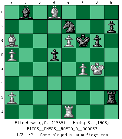 Last move : 1/2-1/2 2009 April 20 23:28:34 [Event "FICGS__CHESS__RAPID_A__000057"] [Site "FICGS"] [Date "2009.01.03"] [Round "1"] [White "Blinchevsky,Alexander"] [Black "Hamby,Stephen"] [Result "1/2-1/2"] [WhiteElo "1969"] [BlackElo "1908"] 1.d4 f5 2.g3 g6 3.h4 Nf6 4.h5 Bg7 5.h6 Bf8 6.Bg2 e6 7.c4 Be7 8.Nc3 O-O 9.Nf3 c6 10.d5 d6 11.Nd4 cxd5 12.cxd5 e5 13.Ne6 Bxe6 14.dxe6 e4 15.Be3 Nc6 16.O-O d5 17.Qb3 Na5 18.Qd1 Rc8 19.Rc1 Rc6 20.Nb5 Nc4 21.Bd4 a6 22.Nc3 Re8 23.b3 Nb6 24.Na4 Nxa4 25.bxa4 Ng4 26.Rxc6 bxc6 27.f3 exf3 28.exf3 Nxh6 29.Qc1 f4 30.Qxc6 Nf5 31.Bb6 Qc8 32.Qxc8 Rxc8 33.gxf4 Kg7 34.Rb1 Rc4 35.a5 Bc5+ 36.Kh2 Rc2 37.Kh3 Bd6 38.Bd8 Be7 39.Bb6 Kf6 40.Bf1 Bd6 41.Re1 Bxf4 42.Bd8+ Ne7 43.Bxa6 Rh2+ 44.Kg4 Bb8 45.f4 1/2-1/2 Dutch defense Kingside Castling by player Black (move 8) Kingside Castling by player White (move 16) This chess game ended in a draw. Follow this game move after move (download)All I want to do, ever, is just play Chess. (Bobby Fischer) Wenn Dein Gegner dir ein Remis anbietet, versuch herauszufinden, weshalb er glaubt schlechter zu stehen. (Nigel Short) El Ajedrez es un regaderazo frío para la mente. (Sir John Simon) Il vaut mieux sacrifier les pièces de l'adversaire. (Xavier Tartacover) Always remember that you are unique; just like everyone else. (Unknown)
