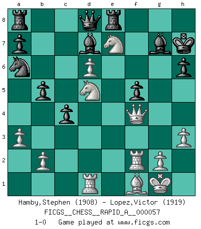 Last move : 1-0 2009 April 8 17:9:17 [Event "FICGS__CHESS__RAPID_A__000057"] [Site "FICGS"] [Date "2009.01.03"] [Round "1"] [White "Hamby,Stephen"] [Black "Lopez,Victor"] [Result "1-0"] [WhiteElo "1908"] [BlackElo "1919"] 1.d4 Nf6 2.c4 g6 3.Nc3 d5 4.Nf3 Bg7 5.Qb3 dxc4 6.Qxc4 O-O 7.e4 Na6 8.Be2 c5 9.d5 e6 10.O-O exd5 11.exd5 Re8 12.Rd1 Bd7 13.Be3 Ng4 14.Bg5 Qb6 15.Rd2 h6 16.Bf4 Qa5 17.Bd3 Nb4 18.Bf1 g5 19.h3 Nxf2 20.Rxf2 gxf4 21.Qxf4 f5 22.a3 b5 23.Rd1 Na6 24.d6 Kh8 25.Nh4 c4 26.Nd5 Qd8 27.Ng6+ Kh7 28.Nge7 1-0 King's Indian defense, 3.Nc3 Kingside Castling by player Black (move 6) Kingside Castling by player White (move 10) Player White won this chess game. Follow this game move after move (download)First-class players lose to second-class players because second-class players sometimes play a first-class game. (Siegbert Tarrasch) Die Auseinandersetzung mit Karpow war politisch geprägt. Er stand für das kommunistische System, wurde von dessen Repräsentanten gehätschelt. Ich war der Oppositionelle. Jeder Schachweltmeister spiegelt auch die gesellschaftlichen Verhältnisse wider. Kramnik steht für die Börsen-Generation des Neuen Markts, ideologiefrei, zahlenfixiert. (Garry Kasparov) El Ajedrez es parte de la cultura, y si una cultura esta en decadencia, entonces también el Ajedrez declinará. (Mikhail Botvinnik) Soyez une menace à chaque fois que vous vous asseyez pour jouer. (Ken Smith) Live, lose, and learn, by observing your opponent how to win. (Amber Steenbock)