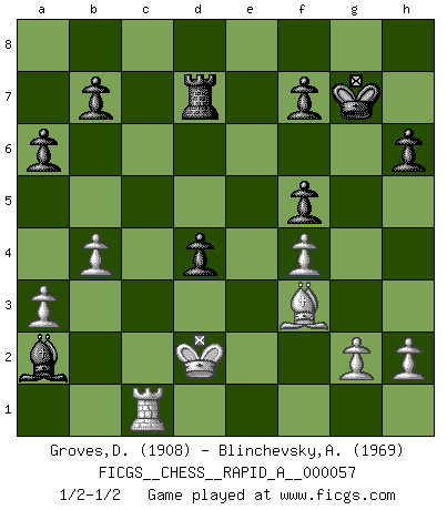 Last move : 1/2-1/2 2009 February 4 2:15:4 [Event "FICGS__CHESS__RAPID_A__000057"] [Site "FICGS"] [Date "2009.01.03"] [Round "1"] [White "Groves,Don"] [Black "Blinchevsky,Alexander"] [Result "1/2-1/2"] [WhiteElo "1908"] [BlackElo "1969"] 1.e4 c6 2.d4 d5 3.exd5 cxd5 4.c4 Nf6 5.Nc3 e6 6.Nf3 Bb4 7.cxd5 Nxd5 8.Qc2 Nc6 9.Bd3 Ba5 10.a3 h6 11.b4 Bb6 12.Nxd5 exd5 13.O-O Nxd4 14.Nxd4 Bxd4 15.Bb2 Bxb2 16.Rae1+ Be6 17.Bb5+ Kf8 18.Qxb2 Qf6 19.Qxf6 gxf6 20.f4 f5 21.Rc1 a6 22.Be2 Kg7 23.Rfd1 Rac8 24.Kf2 Rxc1 25.Rxc1 Rd8 26.Bf3 Rd7 27.Ke3 d4+ 28.Kd2 Ba2 1/2-1/2 Caro-Kann : Panov-Botvinnik attack, 5...e6 Kingside Castling by player White (move 13) This chess game ended in a draw. Follow this game move after move (download)My opponents make good moves too. Sometimes I don't take these things into consideration. (Bobby Fischer) Der Bart als Geschlechtszeichen mitten im Gesicht ist obszön. Daher gefällt er den Weibern. [Zugegeben, kein Schachzitat, aber unglaublich originell] (Arthur Schopenhauer) Cuando tu no sabes absolutamente que mas hacer, es tiempo de entrar en pánico. (John van der Wiel) Les échecs sont utiles à l'exercice de la faculté de penser et à celle de l'imagination. Car nous devons posséder une méthode élaborée pour atteindre des buts partout où nous devons conduire notre raison. (Leibnitz) A specialist learns more and more about less and less until he knows everything about nothing. (Nicholas Murray Butler)