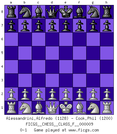 Last move : 0-1 2006 October 2 10:32:44 [Event "FICGS__CHESS__CLASS_F__000009"] [Site "FICGS"] [Date "2006.08.23"] [Round "1"] [White "Alessandrini,Alfredo"] [Black "Cook,Phil"] [Result "0-1"] [WhiteElo "1128"] [BlackElo "1200"] 0-1 This chess game has been lost on time (started : 2006.08.23 7:11:51) Player Black won this chess game. Follow this game move after move (download)Nothing excites jaded Grandmasters more than a theoretical novelty. (Dominic Lawson) Es gibt zwei Arten von Opfern: Korrekte und meine. (Mikhail Nekhemyevich Tal) Todos los jugadores de Ajedrez deberían tener un pasatiempo. (Savielly Tartakower) On est toujours la mazette de quelqu'un d'autre. (Anonyme) Go and wake up your luck. (Persian saying)