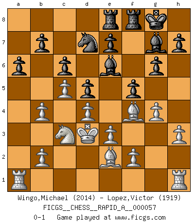 Last move : 0-1 2009 March 21 11:28:54 [Event "FICGS__CHESS__RAPID_A__000057"] [Site "FICGS"] [Date "2009.01.03"] [Round "1"] [White "Wingo,Michael"] [Black "Lopez,Victor"] [Result "0-1"] [WhiteElo "2014"] [BlackElo "1919"] 1.d4 Nf6 2.c4 g6 3.Nc3 d5 4.Bf4 Bg7 5.e3 c6 6.Nf3 O-O 7.h3 Qb6 8.Qb3 Bf5 9.c5 Qxb3 10.axb3 Nbd7 11.b4 a6 12.Nd2 Ne4 13.g4 Nxd2 14.Kxd2 Be6 15.Be2 f5 16.Kd3 Rae8 0-1 This chess game has been lost on time (started : 2009.01.03 2:3:30) King's Indian defense, 3.Nc3 Kingside Castling by player Black (move 6) Player Black won this chess game. Follow this game move after move (download)Chess is a cold bath for the mind. (Sir John Simon) Der vorletzte Fehler gewinnt. (Savielly Grigorievitsch Tartakower) Yo tuve un dolor de muelas en la primer partida. En el segundo juego, tuve un dolor de cabeza. En el tercero, tuve un ataque de reumatísmo. En la cuarta partida, no me sentía muy bien. ¿Y en el quinto juego? Bueno, ¿que acaso uno tiene que ganar todos los juegos?. (Siegbert Tarrasch) Les échecs c'est le défi de l'alpiniste, toujours plus haut, prêt à tout pour monter à l'assaut du Roi ennemi. Les échecs, c'est de la musique en mouvement, un ballet majestueux pour les yeux. C'est de la poésie composée par les fantômes du passé qui au même titre que Rimbaud ou Verlaine méritent notre admiration. Les échecs, c'est de la peinture ou le moindre mouvement modifie le tableau pour en faire un Picasso ou un Van Gogh. Les échecs, c'est tout et rien, c'est la vie et la mort. Jjulie33 sur le forum de France-Echecs. Computers are like Old Testament gods; lots of rules and no mercy. (Joseph Campbell)