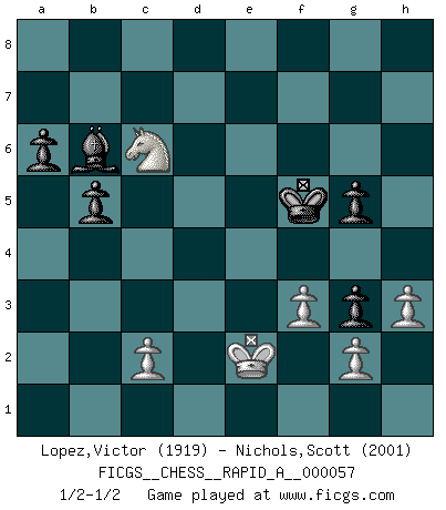 Last move : 1/2-1/2 2009 March 3 21:34:7 [Event "FICGS__CHESS__RAPID_A__000057"] [Site "FICGS"] [Date "2009.01.03"] [Round "1"] [White "Lopez,Victor"] [Black "Nichols,Scott"] [Result "1/2-1/2"] [WhiteElo "1919"] [BlackElo "2001"] 1.e4 c5 2.Nf3 d6 3.d4 cxd4 4.Nxd4 Nf6 5.Nc3 a6 6.Be3 Ng4 7.Bg5 h6 8.Bh4 g5 9.Bg3 Bg7 10.h3 Ne5 11.Nf5 Bxf5 12.exf5 Nbc6 13.Nd5 e6 14.fxe6 fxe6 15.Ne3 O-O 16.Be2 Qb6 17.Qxd6 Nf7 18.Qxe6 Qb4+ 19.Kf1 Nd4 20.Qg6 Qxb2 21.Rd1 Nxe2 22.Kxe2 Rae8 23.Rhe1 Qxa2 24.Kf1 Re6 25.Qd3 Rfe8 26.Re2 Qa4 27.Red2 b5 28.Qd5 Qe4 29.Qb3 Qa4 30.Rd7 R6e7 31.Rxe7 Rxe7 32.Qd5 Qe4 33.Qc5 Re8 34.Rd7 h5 35.Qa7 Qe6 36.Rb7 h4 37.Bb8 Qf6 38.Qc5 Bf8 39.Qf5 Qxf5 40.Nxf5 Nd8 41.Rd7 Ne6 42.Bh2 Nc5 43.Rd5 Ne4 44.Ne3 Kf7 45.Ng4 Bb4 46.f3 Ng3+ 47.Bxg3 hxg3 48.Rf5+ Kg6 49.Re5 Rxe5 50.Nxe5+ Kf5 51.Nc6 Bc5 52.Ke2 Bb6 1/2-1/2 Sicilian : Najdorf, Byrne (English) attack Kingside Castling by player Black (move 15) This chess game ended in a draw. Follow this game move after move (download)A good player is always lucky. (Jose Raul Capablanca) Ein Schachgenie ist jemand der verdammt gut Schach spielt. (Jonathan Levitt) Ayuda a tus piezas para que ellas te puedan ayudar. (Paul Morphy) Le pion, dans sa simplicité, marche droit devant lui, mais lorsqu'il prend, il le fait obliquement? Ainsi l'homme, tant qu'il reste pauvre, marche dans la droiture et vit honnêtement, mais lorsqu'il recherche les honneurs, il flatte, se parjure et, par les voies obliques, cherche une position supérieure sur l'échiquier du monde. (Jean de Galles) You know what they say : You lie down with the Devil, you wake up in Hell. (Horatio Caine, C.S.I. Miami)