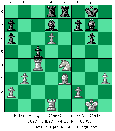 Last move : 1-0 2009 March 13 22:38:45 [Event "FICGS__CHESS__RAPID_A__000057"] [Site "FICGS"] [Date "2009.01.03"] [Round "1"] [White "Blinchevsky,Alexander"] [Black "Lopez,Victor"] [Result "1-0"] [WhiteElo "1969"] [BlackElo "1919"] 1.d4 Nf6 2.c4 g6 3.Nc3 d5 4.Nf3 Bg7 5.Qb3 dxc4 6.Qxc4 O-O 7.e4 Na6 8.Be2 c5 9.d5 e6 10.O-O exd5 11.exd5 Re8 12.Rd1 Qb6 13.h3 Bf5 14.g4 Bd7 15.Be3 h6 16.g5 hxg5 17.Nxg5 Nh7 18.Nxh7 Kxh7 19.Ne4 Kg8 20.Ng5 Qb4 21.d6 Qxc4 22.Bxc4 Rf8 23.Rac1 Rac8 24.Bxa6 bxa6 25.b3 Rfe8 26.Rc4 Rcd8 27.Ne4 1-0 This chess game has been lost on time (started : 2009.01.03 2:3:30) King's Indian defense, 3.Nc3 Kingside Castling by player Black (move 6) Kingside Castling by player White (move 10) Player White won this chess game. Follow this game move after move (download)Up to this point White has been following well-known analysis. But now he makes a fatal error: he begins to use his own head. (Siegbert Tarrasch) Jeder Fehler erscheint unglaublich dumm, wenn andre ihn begehen. (Georg Christoph Lichtenberg) El Ajedrez es un regaderazo frío para la mente. (Sir John Simon) On n'a jamais que l'âge auquel on a commence à jouer aux échecs car après on cesse de vieillir. (Capablanca) Train yourself to let go of everything you fear to lose. (Master Yoda in Star Wars ep.3)