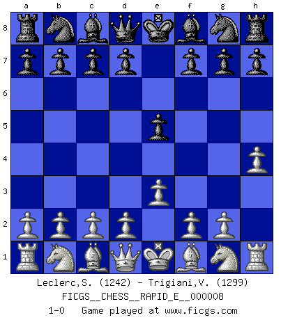 Last move : 1-0 2009 February 5 8:32:37 [Event "FICGS__CHESS__RAPID_E__000008"] [Site "FICGS"] [Date "2009.01.03"] [Round "1"] [White "Leclerc,Sophie"] [Black "Trigiani,Vincenzo"] [Result "1-0"] [WhiteElo "1242"] [BlackElo "1299"] 1.h4 e5 2.e3 1-0 This chess game has been lost on time (started : 2009.01.03 14:26:3) Anti-Borg (Desprez) Opening Player White won this chess game. Follow this game move after move (download)If your opponent cannot do anything active, then don't rush the position; instead you should let him sit there, suffer, and beg you for a draw. (Jeremy Silman) Ich habe die besten Aussichten, den ersten Preis zu gewinnen - denn jeder muss gegen Steinitz spielen, nur ich nicht! (Wilhelm Steinitz) En la perfecta combinación de Ajedrez como en una historia corta de primera clase, toda la trama y contra trama deberá conducir hacia un final sorprendente, el interes no es mitigado hasta el último momento. (Yates and Winter) L'attaque fait le spectacle, la défense gagne les matchs. (Dicton footballistique) Always be a first-rate version of yourself, instead of a second-rate version of somebody else. (Judy Garland)