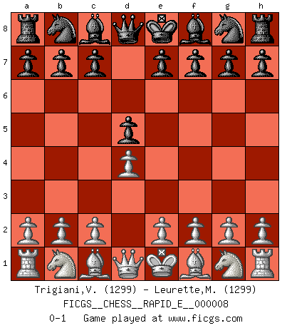 Last move : 0-1 2009 February 4 8:30:41 [Event "FICGS__CHESS__RAPID_E__000008"] [Site "FICGS"] [Date "2009.01.03"] [Round "1"] [White "Trigiani,Vincenzo"] [Black "Leurette,Marc-Antoine"] [Result "0-1"] [WhiteElo "1299"] [BlackElo "1299"] 1.d4 d5 0-1 This chess game has been lost on time (started : 2009.01.03 14:26:3) Queen's pawn game Player Black won this chess game. Follow this game move after move (download)I played Chess with him and would have beaten him sometimes only he always took back his last move, and ran the game out differently. (Mark Twain) Gewöhnliche Menschen denken nur daran, wie sie ihre Zeit verbringen. Ein intelligenter Mensch versucht, sie auszunutzen. (Arthur Schopenhauer) ¿Se han dado cuenta de que Fischer casi nunca ha tenido piezas malas? El las intercambia y las piezas malas se quedan con sus oponenets. (Yuri Balashov) Celui qui prend des risques peut perdre, celui qui n'en prend pas perd toujours. (Xavier Tartacover) Experience is the name we all give to our mistakes. (Oscar Wilde)