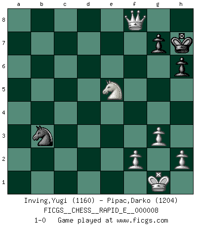 Last move : 1-0 2009 March 12 7:14:47 [Event "FICGS__CHESS__RAPID_E__000008"] [Site "FICGS"] [Date "2009.01.03"] [Round "1"] [White "Inving,Yugi"] [Black "Pipac,Darko"] [Result "1-0"] [WhiteElo "1160"] [BlackElo "1204"] 1.e4 e5 2.Nf3 Nc6 3.Nc3 Bb4 4.Bc4 h6 5.Nd5 Nf6 6.O-O Nxe4 7.Qe2 Nf6 8.Nxb4 Nxb4 9.Qxe5+ Qe7 10.Qxc7 Nxc2 11.Bd3 Nxa1 12.Re1 Qxe1+ 13.Nxe1 O-O 14.b3 Nd5 15.Qe5 Nxb3 16.axb3 Nf6 17.Nf3 Re8 18.Qc7 d6 19.Bb5 Bd7 20.Bxd7 Re7 21.Qxb7 Rae8 22.g3 Nxd7 23.Ba3 Ne5 24.Qd5 Ng4 25.Qxd6 Re6 26.Qd4 Nf6 27.Qxa7 Ne4 28.d4 Nc3 29.Ne5 Nb5 30.Qxf7+ Kh7 31.Bf8 Rxf8 32.Qxe6 Nxd4 33.Qd6 Nxb3 34.Qxf8 1-0 Three knights game Kingside Castling by player White (move 6) Kingside Castling by player Black (move 13) 10 pieces endgame at move 34 : White KQNPPP , Black KNPP WHITE : King + 1 Queen 1 Knight 3 Pawns BLACK : King + 1 Knight 2 Pawns Player White won this chess game. Follow this game move after move (download)Some part of a mistake is always correct. (Savielly Tartakover) Schach sollte überall auf der Welt Schulfach werden. Es fördert die geistige Auseinandersetzung. Es lehrt die Demut in der Niederlage. (Garry Kasparov) Cuando estes solo, cuando te sientas un extraño en el mundo, juega al Ajedrez. Esto levantará tu espiritu y será tu consejero de guerra. (Aristóteles) C'est la seule position que je connaisse où les deux camps sont mals. Propos prêtés à V. Anand. Pushing plastic is for the many, pushing virtual pieces is for the fewer, pushing wood is for the very few. (Normajean Yates)