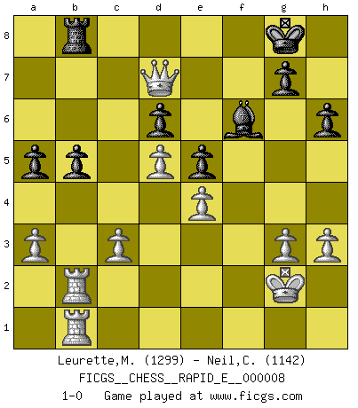Last move : 1-0 2009 February 22 19:5:2 [Event "FICGS__CHESS__RAPID_E__000008"] [Site "FICGS"] [Date "2009.01.03"] [Round "1"] [White "Leurette,Marc-Antoine"] [Black "Neil,Charlie"] [Result "1-0"] [WhiteElo "1299"] [BlackElo "1142"] 1.e4 e5 2.Nf3 Nc6 3.Bc4 Bc5 4.b4 Bxb4 5.c3 Be7 6.d4 d6 7.O-O Nf6 8.Re1 O-O 9.d5 Na5 10.Na3 Nxc4 11.Nxc4 Bg4 12.Qd3 Ne8 13.Ncd2 f5 14.h3 Bxf3 15.Nxf3 f4 16.Rb1 b6 17.g3 fxg3 18.fxg3 Nf6 19.Ng5 Qe8 20.Ne6 Rf7 21.Nxc7 Qc8 22.Nxa8 Qxa8 23.Be3 Qc8 24.Kg2 Qd8 25.Rf1 Rf8 26.Bg5 h6 27.Bxf6 Bxf6 28.Qe2 Qe8 29.Rf2 Qg6 30.Qg4 Qf7 31.Rbf1 b5 32.a3 Qe7 33.Rb1 a6 34.Rbf1 a5 35.Rb2 Qd7 36.Rfb1 Rb8 37.Qxd7 1-0 Evans gambit : 5...Be7 Kingside Castling by player White (move 7) Kingside Castling by player Black (move 8) Player White won this chess game. Follow this game move after move (download)I still hope to kill Fischer. (Boris Spassky) Es liegt in der Natur, vernüftig zu denken und unlogisch zu handeln. (Anatole France) El Ajedrez es parte de una cultura y si una cultura esta en decadencia, entonces también el Ajedrez declinará. (Mikhail Botvinnik) Si rien de grave n'est détecté lors de l'analyse d'une position, on joue alors le coup. Seconde règle de Blumenfeld. Perfection is achieved, not when there is nothing more to add, but when there is nothing left to take away. (Antoine de Saint-Exupéry)
