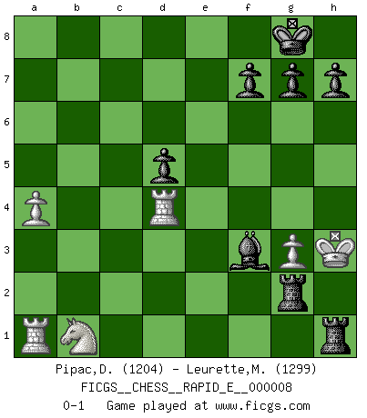 Last move : 0-1 2009 January 12 14:34:4 [Event "FICGS__CHESS__RAPID_E__000008"] [Site "FICGS"] [Date "2009.01.03"] [Round "1"] [White "Pipac,Darko"] [Black "Leurette,Marc-Antoine"] [Result "0-1"] [WhiteElo "1204"] [BlackElo "1299"] 1.e4 e5 2.Nf3 Nc6 3.Bb5 Nf6 4.Bxc6 bxc6 5.Nxe5 Nxe4 6.Qf3 Nf6 7.d4 d6 8.Nxc6 Qd7 9.Nb4 d5 10.Bd2 Rb8 11.Qe3+ Qe7 12.Qxe7+ Bxe7 13.Nc6 Rxb2 14.Nxa7 O-O 15.Nc6 Re8 16.c3 Bd6 17.Be3 Ng4 18.O-O Bxh2+ 19.Kh1 Bg3 20.fxg3 Rxe3 21.Ne5 Nxe5 22.dxe5 Rxe5 23.Rd1 Bg4 24.Rd4 Re1+ 25.Kh2 Bf3 26.c4 c6 27.cxd5 cxd5 28.a4 Rxg2+ 29.Kh3 Rh1+ 0-1 Ruy Lopez : Berlin defense Kingside Castling by player Black (move 14) Kingside Castling by player White (move 18) Player Black won this chess game. Follow this game move after move (download)Who is your opponent tonight, tonight I am playing against the Black pieces. (Akiba Rubinstein) Jeder weiß, dass Gasprom Putins persönliches Machtinstrument ist. Die Firma wird vom Kreml aus geleitet und wird schon deshalb nie transparent sein. (Garry Kasparov) Las Aperturas te enseñan aperturas. ¡Los Finales te enseñan Ajedrez!. (Stephan Gerzadowicz) On croit qu'il y a plus de mauvais joueurs que de bons joueurs, c'est faux : Il y a autant de joueurs qui gagnent que de joueurs qui perdent. (Philippe Geluck) The good fighters of old first put themselves beyond the possibility of defeat, and then waited for an opportunity of defeating the enemy. (Sun Tzu)