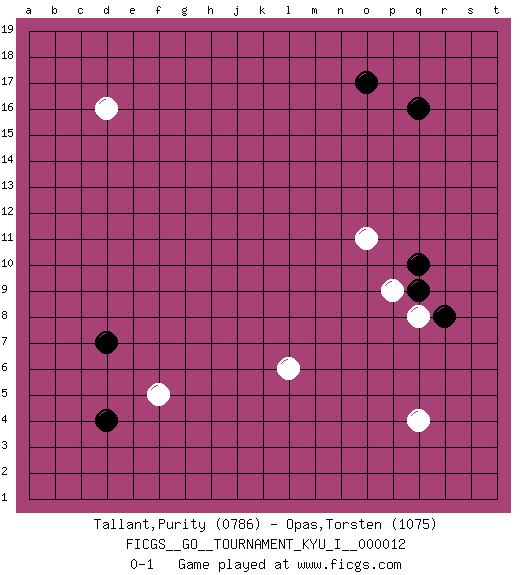 Last move : 0-1 2009 February 20 21:30:5 [Event "FICGS__GO__TOURNAMENT_KYU_I__000012"] [Site "FICGS"] [Date "2009.01.05"] [Round "1"] [Black "Tallant,Purity"] [White "Opas,Torsten"] [Result "0-1"] [Rating 1 "0786"] [Rating 2 "1075"] 1.d4 d16 2.d7 q4 3.q16 o11 4.o17 l6 5.q10 p9 6.q9 q8 7.r8 f5 0-1 This go game has been lost on time (started : 2009.01.05 0:2:36) Here are the names of the openings (joseki) played in the four corners : Corner q16 : q16 o11 Hoshi (Hwajeom, Seongjeom, Xingwei`) 4-4 Point. The star or hoshi (4-4) point, emphasizing influence at the potential expense of territory. Player White won this Go (weiqi, baduk) game. Follow this game move after move (download)Go is to western chess what philosophy is to double entry accounting. (from Shibumi, by Trevanian) Creativity is inventing, experimenting, growing, taking risks, breaking rules, making mistakes, and having fun. (Mary Lou Cook)