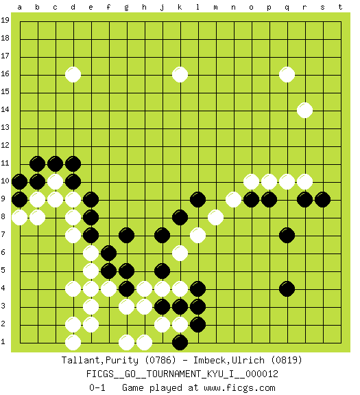 Last move : 0-1 2009 April 10 2:31:47 [Event "FICGS__GO__TOURNAMENT_KYU_I__000012"] [Site "FICGS"] [Date "2009.01.05"] [Round "1"] [Black "Tallant,Purity"] [White "Imbeck,Ulrich"] [Result "0-1"] [Rating 1 "0786"] [Rating 2 "0819"] 1.q4 q16 2.q7 d4 3.g4 d16 4.d11 d9 5.e9 d7 6.b10 c10 7.d10 c9 8.c11 b9 9.b11 q10 10.r9 r10 11.s9 k16 12.e8 d8 13.a9 a8 14.a10 b8 15.e7 e6 16.e4 e5 17.f5 e3 18.f3 f4 19.f6 e4 20.f2 e2 21.e1 d1 22.f1 d2 23.g7 o10 24.o9 g3 25.g2 h3 26.h2 j2 27.j3 h4 28.g5 j4 29.k3 k2 30.l2 k4 31.l3 h1 32.k1 g1 33.l4 k6 34.j7 l7 35.j5 m8 36.k8 n9 37.l9 r14 38.p9 p10 0-1 This go game has been lost on time (started : 2009.01.05 0:2:36) Here are the names of the openings (joseki) played in the four corners : Corner d4 : d4 g4 Hoshi (Hwajeom, Seongjeom, Xingwei`) 4-4 Point. The star or hoshi (4-4) point, emphasizing influence at the potential expense of territory. Nikken Takagakari (Dukan Nop'dakeolch'im, E`r Gaojia, 2-Space High Approach). Black 2 is a light approach move. Rarely played in even games, Black 2 is typically employed in handicap games. White continues with 6-4 or 3-10. In Korean Sunjang Baduk White has a stone on 8-4. Corner d16 : d16 d11 Hoshi (Hwajeom, Seongjeom, Xingwei`) 4-4 Point. The star or hoshi (4-4) point, emphasizing influence at the potential expense of territory. Player White won this Go (weiqi, baduk) game. Follow this game move after move (download)One big eye kills one small eye. (Anonymous) If you ain't just a little scared when you enter a casino, you are either very rich or you haven't studied the games enough. (Pappy)