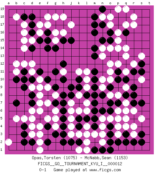 Last move : 0-1 2009 August 31 21:47:11 [Event "FICGS__GO__TOURNAMENT_KYU_I__000012"] [Site "FICGS"] [Date "2009.01.05"] [Round "1"] [Black "Opas,Torsten"] [White "McNabb,Sean"] [Result "0-1"] [Rating 1 "1075"] [Rating 2 "1153"] 1.q16 d4 2.d16 q4 3.k10 q14 4.p11 o12 5.p5 p4 6.o4 q5 7.f6 d6 8.m14 o11 9.p10 o17 10.o16 n16 11.n17 p16 12.o15 p15 13.p17 o18 14.p18 o14 15.n15 q17 16.q18 r17 17.m5 p6 18.h4 n18 19.m17 n14 20.m16 r18 21.c10 f17 22.c3 d3 23.c4 c5 24.r7 c14 25.f14 c17 26.o3 o5 27.e5 d5 28.d17 c16 29.d2 e2 30.c2 e3 31.b7 b5 32.d18 d15 33.e15 e16 34.f16 e17 35.g17 g16 36.f15 g18 37.h17 f18 38.d7 e7 39.d8 e6 40.f8 f7 41.g7 e8 42.e9 g6 43.d14 c15 44.h6 g5 45.c18 b18 46.f4 g4 47.p13 p14 48.n6 h18 49.g3 f5 50.s3 s5 51.h5 e4 52.p7 n5 53.p2 n4 54.q3 p3 55.r2 n3 56.o2 a2 57.o6 k3 58.k4 l4 59.m4 m3 60.l5 l3 61.j2 j4 62.q6 p5 63.o13 n13 64.k5 j3 65.h3 j5 66.m7 j6 67.h7 r6 68.s7 q7 69.q8 q6 70.r9 r4 71.k2 l2 72.n1 p8 73.o7 o8 74.k7 k6 75.m8 l7 76.l8 l6 77.m6 j7 78.j8 k8 79.j9 l9 80.m9 l10 81.k9 n10 82.m10 q9 83.r8 k1 84.h2 n2 85.m1 l1 86.o1 r3 87.q2 l11 88.o9 n9 89.n8 f9 90.f10 g8 91.h8 k11 92.h12 g10 93.h10 h11 94.g11 e10 95.g9 d9 96.m11 r12 97.m13 j17 98.s2 d12 99.m18 p19 100.e11 d11 101.c9 b11 102.c11 c12 103.b10 b12 104.h15 h16 105.j15 g15 106.g14 s10 107.f2 e1 108.q12 p12 109.r11 q13 110.d10 e9 111.s11 q11 112.s12 s13 113.q10 o10 114.n19 q19 0-1 Here are the names of the openings (joseki) played in the four corners : Corner q16 : q16 q14 Hoshi (Hwajeom, Seongjeom, Xingwei`) 4-4 Point. The star or hoshi (4-4) point, emphasizing influence at the potential expense of territory. Ikken Takagakari (Hankan Nop'dakeolch'im, Yi Gaojia, 1-Space High Approach). Black typically responds at 6-4 or 3-10. Black 4-10 is played when Black finds play on the right side advantageous. Black 4-8 or 3-8 may be played when Black has support at top. Corner q4 : q4 p5 Hoshi (Hwajeom, Seongjeom, Xingwei`) 4-4 Point. The star or hoshi (4-4) point, emphasizing influence at the potential expense of territory. Corner d4 : d4 f6 Hoshi (Hwajeom, Seongjeom, Xingwei`) 4-4 Point. The star or hoshi (4-4) point, emphasizing influence at the potential expense of territory. Corner d16 : d16 f17 Hoshi (Hwajeom, Seongjeom, Xingwei`) 4-4 Point. The star or hoshi (4-4) point, emphasizing influence at the potential expense of territory. Ikken Kakari (Hankan Keolch'im, Yi Gua`jiao~, 1-Space Low Approach). White 2 is the standard approach move to the 4-4. Player White won this Go (weiqi, baduk) game. Follow this game move after move (download)Eyes win semiais. (Anonymous) A bird doesn't sing because it has an answer, it sings because it has a song. (Maya Angelou)