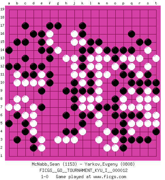 Last move : 1-0 2009 July 2 21:25:43 [Event "FICGS__GO__TOURNAMENT_KYU_I__000012"] [Site "FICGS"] [Date "2009.01.05"] [Round "1"] [Black "McNabb,Sean"] [White "Yarkov,Evgeny"] [Result "1-0"] [Rating 1 "1153"] [Rating 2 "0808"] 1.q16 q4 2.d16 d4 3.k16 k4 4.r6 s5 5.q10 d10 6.o4 o3 7.n3 n2 8.p3 o2 9.p4 m3 10.r3 n4 11.o6 k10 12.c7 b7 13.b6 b8 14.c5 d5 15.c4 d6 16.d3 e3 17.d2 e2 18.b3 c6 19.a5 d15 20.c15 d14 21.e16 c14 22.b15 b14 23.c17 f15 24.g17 f16 25.f17 q5 26.q6 a7 27.k13 j13 28.k12 j12 29.k6 j11 30.h6 g3 31.h9 j9 32.j8 k8 33.j7 k7 34.l6 m6 35.e7 d7 36.e9 c8 37.f11 e11 38.j4 j3 39.h4 h3 40.k5 m5 41.f13 l7 42.e15 g14 43.e14 e13 44.f14 h13 45.e12 d13 46.d12 c12 47.d11 e10 48.c11 b11 49.b12 b13 50.a12 a13 51.c13 r7 52.a14 s6 53.p5 q7 54.p6 r5 55.q3 s7 56.o8 p8 57.p9 q9 58.r9 r8 59.r10 s9 60.s10 p7 61.o7 c10 62.f10 b10 63.m7 m8 64.n7 l12 65.l11 l13 66.k14 m11 67.l10 m10 68.l9 k11 69.k9 l8 70.j10 m9 71.j9 k15 72.l15 j15 73.l14 m12 74.o10 j16 75.k17 m14 76.m15 n13 77.o14 o12 78.p12 n11 79.n14 m13 80.t9 s8 81.s3 t8 82.t10 t6 83.t4 t5 84.p11 p13 85.o13 q12 86.p14 q13 87.q14 r13 88.s15 s12 89.p2 s14 90.r15 r11 91.s11 t13 92.q11 1-0 This go game has been lost on time (started : 2009.01.05 0:2:36) Here are the names of the openings (joseki) played in the four corners : Corner q4 : q4 r6 Hoshi (Hwajeom, Seongjeom, Xingwei`) 4-4 Point. The star or hoshi (4-4) point, emphasizing influence at the potential expense of territory. Ikken Kakari (Hankan Keolch'im, Yi Gua`jiao~, 1-Space Low Approach). Black 2 is the standard approach move to the 4-4. Corner d4 : d4 c7 Hoshi (Hwajeom, Seongjeom, Xingwei`) 4-4 Point. The star or hoshi (4-4) point, emphasizing influence at the potential expense of territory. Nikken Kakari (Dukan Keolch'im, E`r Gua`jiao~, 2-Space Low Approach). White typically answers by 7-3 or 3-5 (which is not joseki). Corner d16 : d16 d15 Hoshi (Hwajeom, Seongjeom, Xingwei`) 4-4 Point. The star or hoshi (4-4) point, emphasizing influence at the potential expense of territory. Corner q16 : q16 l12 Hoshi (Hwajeom, Seongjeom, Xingwei`) 4-4 Point. The star or hoshi (4-4) point, emphasizing influence at the potential expense of territory. Player Black won this Go (weiqi, baduk) game. Follow this game move after move (download)In an unreasonable situation, an unreasonable move is reasonable. (Tamino) Depression is just anger without enthusiasm. (Unknown)