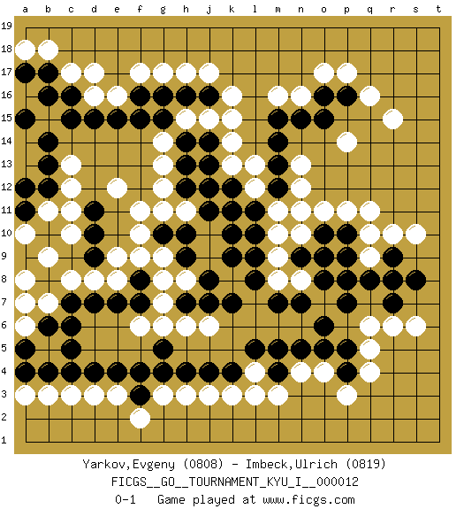 Last move : 0-1 2009 September 1 21:49:11 [Event "FICGS__GO__TOURNAMENT_KYU_I__000012"] [Site "FICGS"] [Date "2009.01.05"] [Round "1"] [Black "Yarkov,Evgeny"] [White "Imbeck,Ulrich"] [Result "0-1"] [Rating 1 "0808"] [Rating 2 "0819"] 1.d4 d16 2.c16 c17 3.c15 e16 4.d15 q4 5.d10 q16 6.k4 q10 7.k10 m3 8.m4 n4 9.n5 l4 10.m5 l3 11.l5 o4 12.o5 k16 13.p10 p11 14.p9 q9 15.q8 q6 16.p7 o11 17.o10 m11 18.l11 n10 19.n9 m9 20.o8 n8 21.n7 m8 22.o6 r15 23.f16 f17 24.f15 g17 25.e15 k8 26.j8 k14 27.j14 j15 28.h14 c3 29.c4 d3 30.e4 e3 31.f3 f2 32.g4 g3 33.f4 h3 34.h4 j3 35.j4 k3 36.p5 q5 37.r8 q11 38.p4 p3 39.s8 s6 40.m12 n12 41.m13 n13 42.m14 m16 43.n15 n16 44.o15 p14 45.p16 p17 46.o16 o17 47.m15 s10 48.r7 r6 49.r9 r10 50.h16 h15 51.g16 h17 52.j16 j17 53.g15 k15 54.k9 k13 55.j13 l12 56.l10 m10 57.l8 b5 58.b4 b7 59.c6 b9 60.b6 b11 61.b12 c12 62.b13 c13 63.b14 e12 64.k12 l13 65.l9 c10 66.d11 c11 67.d9 c8 68.d7 j12 69.k11 g14 70.h13 g13 71.h12 g12 72.j11 h11 73.j12 f11 74.m7 o9 75.p8 d8 76.n9 n11 77.o9 e9 78.a5 g9 79.c5 g7 80.h7 h8 81.k7 h6 82.j7 f6 83.a7 a8 84.c7 a6 85.b17 d17 86.a11 a10 87.a12 b18 88.b16 a7 89.a17 a18 90.a15 b3 91.a4 a3 92.e7 e8 93.g5 g6 94.h9 g8 95.h10 g11 96.g10 f10 97.f7 j6 98.f8 f9 0-1 This go game has been lost on time (started : 2009.01.05 0:2:36) Here are the names of the openings (joseki) played in the four corners : Corner d16 : d16 c16 Hoshi (Hwajeom, Seongjeom, Xingwei`) 4-4 Point. The star or hoshi (4-4) point, emphasizing influence at the potential expense of territory. Player White won this Go (weiqi, baduk) game. Follow this game move after move (download)The saki bottle shape is negative. (Anonymous) Winning isn't everything... but losing is nothing. (Mednis)