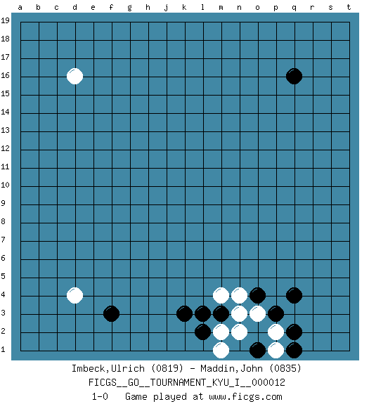 Last move : 1-0 2009 February 27 9:51:39 [Event "FICGS__GO__TOURNAMENT_KYU_I__000012"] [Site "FICGS"] [Date "2009.01.05"] [Round "1"] [Black "Imbeck,Ulrich"] [White "Maddin,John"] [Result "1-0"] [Rating 1 "0819"] [Rating 2 "0835"] 1.q16 d4 2.q4 d16 3.f3 o3 4.p3 p2 5.q2 p1 6.q1 n2 7.o4 n4 8.m3 n3 9.k3 m2 10.l2 m4 11.l3 m1 12.o1 1-0 This go game has been lost on time (started : 2009.01.05 0:2:36) Here are the names of the openings (joseki) played in the four corners : Corner d4 : d4 f3 Hoshi (Hwajeom, Seongjeom, Xingwei`) 4-4 Point. The star or hoshi (4-4) point, emphasizing influence at the potential expense of territory. Ikken Kakari (Hankan Keolch'im, Yi Gua`jiao~, 1-Space Low Approach). Black 2 is the standard approach move to the 4-4. Corner q4 : q4 o3 Hoshi (Hwajeom, Seongjeom, Xingwei`) 4-4 Point. The star or hoshi (4-4) point, emphasizing influence at the potential expense of territory. Ikken Kakari (Hankan Keolch'im, Yi Gua`jiao~, 1-Space Low Approach). White 2 is the standard approach move to the 4-4. Player Black won this Go (weiqi, baduk) game. Follow this game move after move (download)More haste less speed. (John Fairbairn) I think your argument is specious - I think your tie is ugly. (Gregory House to Dr. Foreman, House M.D.)