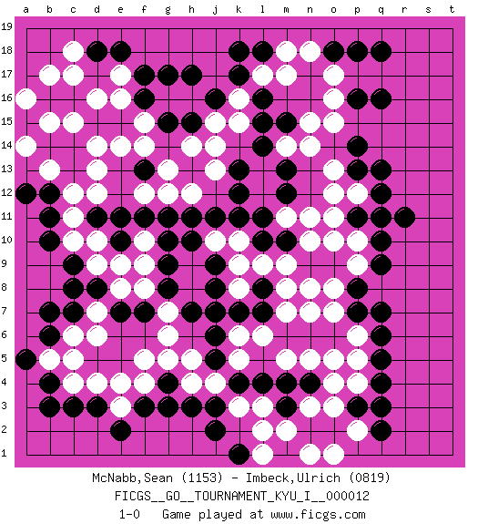 Last move : 1-0 2009 August 6 16:50:28 [Event "FICGS__GO__TOURNAMENT_KYU_I__000012"] [Site "FICGS"] [Date "2009.01.05"] [Round "1"] [Black "McNabb,Sean"] [White "Imbeck,Ulrich"] [Result "1-0"] [Rating 1 "1153"] [Rating 2 "0819"] 1.q16 d16 2.q4 d4 3.f17 e17 4.f16 o17 5.k17 o15 6.p16 o16 7.q13 o3 8.m3 o5 9.q7 k3 10.k4 l3 11.l4 m2 12.n2 n3 13.m4 l2 14.h3 j4 15.j3 h4 16.f3 f4 17.g4 g5 18.g3 f5 19.d3 e3 20.e2 e4 21.c3 c4 22.b4 b5 23.o2 p2 24.p3 p4 25.q3 n1 26.n4 o4 27.j6 h5 28.m6 o7 29.l15 o13 30.q10 d10 31.m13 m14 32.m15 n14 33.l14 d14 34.m10 m7 35.n6 n7 36.o6 p6 37.p7 l6 38.j2 k5 39.q5 m5 40.f13 f14 41.e15 e14 42.d15 c15 43.c16 c17 44.b16 b17 45.c14 b15 46.c13 d12 47.b11 c12 48.b14 a16 49.b12 d13 50.c9 a14 51.b7 c10 52.b10 d9 53.c8 b13 54.d8 e8 55.e7 f8 56.f7 g7 57.b3 l9 58.l10 k10 59.k11 j10 60.j11 g13 61.g11 d6 62.b6 c5 63.a5 d7 64.h10 h9 65.g9 h8 66.g8 f9 67.g10 f10 68.h7 g6 69.j8 k9 70.j9 f15 71.q18 m17 72.l18 m18 73.p14 n15 74.p18 o11 75.o9 l17 76.k18 n10 77.n9 m9 78.m12 q11 79.r11 p10 80.q12 p9 81.q9 o8 82.e18 e16 83.d18 m11 84.l11 n11 85.q2 o1 86.h15 h12 87.h11 j13 88.k13 j15 89.j16 g16 90.g17 h16 91.g15 k16 92.h17 j14 93.k12 c18 94.q6 p5 95.f11 f12 96.e10 e9 97.e11 g12 98.d11 c11 99.o18 n18 100.p11 p12 101.q11 h14 102.p8 o10 103.p13 o12 104.c7 c6 105.k7 k8 106.l8 n8 107.l7 k6 108.l16 m8 109.j7 k15 110.j5 n5 111.k1 l1 112.a12 1-0 Here are the names of the openings (joseki) played in the four corners : Corner d16 : d16 f17 Hoshi (Hwajeom, Seongjeom, Xingwei`) 4-4 Point. The star or hoshi (4-4) point, emphasizing influence at the potential expense of territory. Ikken Kakari (Hankan Keolch'im, Yi Gua`jiao~, 1-Space Low Approach). Black 2 is the standard approach move to the 4-4. Corner q16 : q16 o17 Hoshi (Hwajeom, Seongjeom, Xingwei`) 4-4 Point. The star or hoshi (4-4) point, emphasizing influence at the potential expense of territory. Ikken Kakari (Hankan Keolch'im, Yi Gua`jiao~, 1-Space Low Approach). White 2 is the standard approach move to the 4-4. Corner q4 : q4 o3 Hoshi (Hwajeom, Seongjeom, Xingwei`) 4-4 Point. The star or hoshi (4-4) point, emphasizing influence at the potential expense of territory. Ikken Kakari (Hankan Keolch'im, Yi Gua`jiao~, 1-Space Low Approach). White 2 is the standard approach move to the 4-4. Corner d4 : d4 h3 Hoshi (Hwajeom, Seongjeom, Xingwei`) 4-4 Point. The star or hoshi (4-4) point, emphasizing influence at the potential expense of territory. Player Black won this Go (weiqi, baduk) game. Follow this game move after move (download)For rectangular six in the corner, dame is necessary. (Anonymous) Remember : Your focus determines your reality. (Qui-Gon Jinn in Star Wars ep.1)