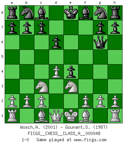 Last move : 1-0 2009 February 18 21:26:51 [Event "FICGS__CHESS__CLASS_A__000048"] [Site "FICGS"] [Date "2009.01.05"] [Round "1"] [White "Wosch,Arkadiusz"] [Black "Gounant,Stanislas"] [Result "1-0"] [WhiteElo "2001"] [BlackElo "1987"] 1.e4 e5 2.Nf3 f5 3.Nxe5 Qf6 4.d4 d6 5.Nc4 fxe4 6.Nc3 Qg6 7.Ne3 1-0 This chess game has been lost on time (started : 2009.01.05 4:31:7) Latvian counter-gambit Player White won this chess game. Follow this game move after move (download)When asked, -How is that you pick better moves than your opponents?, I responded: I'm very glad you asked me that, because, as it happens, there is a very simple answer. I think up my own moves, and I make my opponent think up his. (Alexander Alekhine) Der Umstand, daß uns eine 7 Stunden Zeitkontrolle ermöglicht eine großartige, tiefe Partie zu spielen, ist für die Massenmedien nicht weiter von Bedeutung. (Alexej Shirov) El Ajedrez es el arte del análisis. (Mikhail Botvinnik) A ce moment-là, je menaçais de comprendre la position ! (Clément L'Heureux) Knowledge will give you power, but character respect. (Bruce Lee)