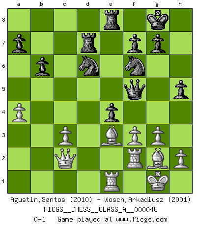 Last move : 0-1 2009 July 4 8:22:19 [Event "FICGS__CHESS__CLASS_A__000048"] [Site "FICGS"] [Date "2009.01.05"] [Round "1"] [White "Agustin,Santos"] [Black "Wosch,Arkadiusz"] [Result "0-1"] [WhiteElo "2010"] [BlackElo "2001"] 1.c4 Nf6 2.Nc3 e5 3.g3 Bb4 4.Bg2 O-O 5.e4 Bxc3 6.bxc3 d6 7.d3 Nbd7 8.Nf3 Re8 9.O-O Nc5 10.Nh4 b6 11.f3 Nb7 12.Be3 c6 13.Qa4 Bd7 14.Qc2 Rc8 15.Nf5 Bxf5 16.exf5 d5 17.Rae1 Nd6 18.cxd5 cxd5 19.Bd2 h5 20.a4 Qd7 21.Bh3 Qc6 22.Qd1 Rc7 23.Rf2 e4 24.Bf4 Rd7 25.Qb3 Rc8 26.dxe4 dxe4 27.Bg2 Re8 28.Qc2 Qc5 29.Be3 Qxf5 0-1 English Opening Kingside Castling by player Black (move 4) Kingside Castling by player White (move 9) Player Black won this chess game. Follow this game move after move (download)Chess is a terrific way for kids to build self image and self esteem. (Saudin Robovic) Spielt Blackmar-Diemer-Gambit, und das Matt kommt von selbst! (Emil Joseph Diemer) Observen a Garry Kasparov. Después de una derrota, invariablemente el gana la próxima partida. Prácticamente hace pedazos a su siguiente oponente. Eso es algo que tenemos que aprender a lograr. (Maurice Ashley) Il n'y a pas eu de défaite parce que je ne crois pas que cet ordinateur ait jamais existé. IBM a triché en refusant d'imprimer les modes de recherche de la machine. C'est évident, pendant le match, des coups décisifs ont été joués par des êtres humains. Aujourd'hui, les meilleurs spécialistes en informatique ne peuvent toujours pas expliquer comment Deep-Blue a pu jouer contre la logique des ordinateurs. IBM a gagné une guerre de communication, mais ils sont incapables de prouver que l'ordinateur a gagné tout seul. (Garry Kasparov) Thibault, I ask for draw. Game 13876. - Sorry Ilmars, you won. (FICGS chat)