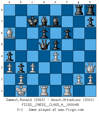 Last move : 0-1 2009 July 31 0:0:12 [Event "FICGS__CHESS__CLASS_A__000048"] [Site "FICGS"] [Date "2009.01.05"] [Round "1"] [White "Sammut,Ronald"] [Black "Wosch,Arkadiusz"] [Result "0-1"] [WhiteElo "2063"] [BlackElo "2001"] 1.e4 c5 2.Nf3 Nc6 3.d4 cxd4 4.Nxd4 Nf6 5.Nc3 d6 6.Bg5 e6 7.Qd2 a6 8.O-O-O Bd7 9.f4 b5 10.Bxf6 gxf6 11.Kb1 Qb6 12.Nxc6 Bxc6 13.Qe1 Be7 14.f5 Qc5 15.Bd3 b4 16.Ne2 a5 17.fxe6 fxe6 18.Nf4 Bd7 19.Rf1 a4 20.Qh4 O-O-O 21.c3 b3 22.a3 Rdg8 23.Qh3 e5 24.Ba6+ Kc7 25.Nd5+ Qxd5 0-1 This chess game has been lost on time (started : 2009.01.05 4:31:7) Sicilian defense Queenside Castling by player White (move 8) Queenside Castling by player Black (move 20) Player Black won this chess game. Follow this game move after move (download)Fischer Chess play was always razor-sharp, rational and brilliant. One of the best ever. (Dave Regis) Wenn du gegen Bobby spielst, ist es keine Frage von gewinnen oder verlieren. Es ist eine Frage des Überlebens. (Boris Vassilievich Spassky) Existen dos clases de sacrificios: los correctos y los míos. (Mikhail Tal) Pour se monter efficace, un Cavalier a besoin d'avant-postes ! Les Cavaliers font les meilleurs bloqueurs de pions passés. There is no vagueness without wind. (Chinese proverb)