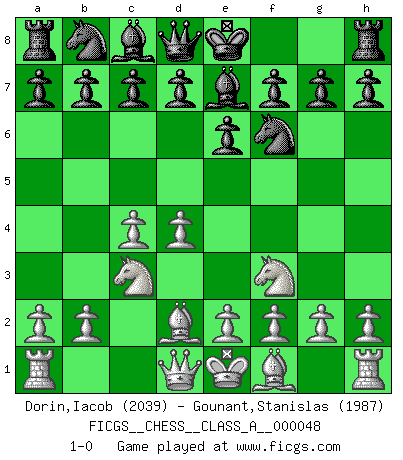 Last move : 1-0 2009 February 17 9:16:40 [Event "FICGS__CHESS__CLASS_A__000048"] [Site "FICGS"] [Date "2009.01.05"] [Round "1"] [White "Dorin,Iacob"] [Black "Gounant,Stanislas"] [Result "1-0"] [WhiteElo "2039"] [BlackElo "1987"] 1.Nf3 Nf6 2.d4 e6 3.c4 Bb4+ 4.Bd2 Be7 5.Nc3 1-0 This chess game has been lost on time (started : 2009.01.05 4:31:7) Reti Opening Player White won this chess game. Follow this game move after move (download)It began to feel as though you were playing against Chess itself. - On playing against Robert Fischer. (Walter Shipman) Wie, soll nun auch die Opposition abgeschafft werden? Ja, es tut mir leid, Ihnen diesen Schmerz nicht ersparen zu können. (Aaron Nimzowitsch) Solo el jugador con la iniciativa tiene el derecho a atacar. (Wilhelm Steinitz) L'ordinateur a tué l'originalité. Il n'y a plus guère d'aventures sur l'échiquier. (Jacob Murray) Philosophers use a language that is already deformed as though by shoes that are too tight. (Ludwig Wittgenstein)