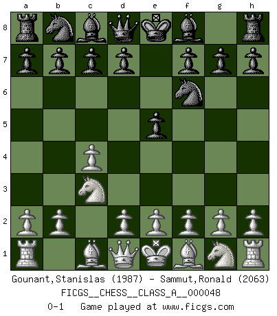 Last move : 0-1 2009 February 23 9:37:19 [Event "FICGS__CHESS__CLASS_A__000048"] [Site "FICGS"] [Date "2009.01.05"] [Round "1"] [White "Gounant,Stanislas"] [Black "Sammut,Ronald"] [Result "0-1"] [WhiteElo "1987"] [BlackElo "2063"] 1.c4 Nf6 2.Nc3 e5 0-1 This chess game has been lost on time (started : 2009.01.05 4:31:7) English Opening Player Black won this chess game. Follow this game move after move (download)The most important feature of the Chess position is the activity of the pieces. This is absolutely fundamental in all phases of the game: Opening, Middlegame and especially Endgame. The primary constraint on a piece's activity is the Pawn structure. (Michael Stean) Wie kann ich Remis annehmen? Ich weiß ja gar nicht, wie ich stehe! (Fritz Sämisch) No soy una persona materialista y por eso, no resiento la falta o pérdida del dinero. La ausencia de cosas mundanas carece de importancia. Ya que el Ajedrez es una forma en la que puedo ser tan materialista como yo desee sin tener la necesidad de vender mi alma. (Jamie Walter Adams) Le temps de noter son nom sur la feuille de partie, j'étais déjà en zeitnot ! D'un modeste amateur apparié lors de la première ronde d'un open contre le grand-maître Azmaïparashvili. Mandala - that's it! 16x16 squares as multiple of the four and the eight because of the Four Noble Truths and the Noble Eightfold Path. (Heinz-Georg Lehnhoff about Big Chess)