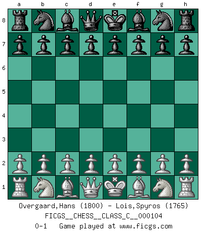 Last move : 0-1 2009 February 15 21:9:11 [Event "FICGS__CHESS__CLASS_C__000104"] [Site "FICGS"] [Date "2009.01.06"] [Round "1"] [White "Overgaard,Hans"] [Black "Lois,Spyros"] [Result "0-1"] [WhiteElo "1800"] [BlackElo "1765"] 0-1 This chess game has been lost on time (started : 2009.01.06 3:16:35) Player Black won this chess game. Follow this game move after move (download)We like to think. (Gary Kasparov) Viele Opfer benötigen überhaupt keine konkrete Berechnung. Es genügt sich die entstehende Position kurz vorzustellen, um uns davon zu überzeugen, dass das Opfer korrekt ist. (Mikhail Nekhemyevich Tal) Juega la Apertura como un libro, el Juego Medio como un mago y los Finales como una máquina. (Spielmann) Le plus grand jeu de l'esprit jamais inventé, plus vous l'apprenez, plus vous y prenez du plaisir. (Garry Kasparov) Life is verb, not a noun. (Charlotte Perkins Gilman)
