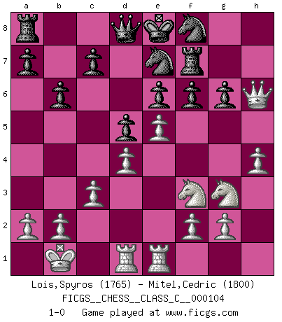 Last move : 1-0 2009 January 24 1:30:25 [Event "FICGS__CHESS__CLASS_C__000104"] [Site "FICGS"] [Date "2009.01.06"] [Round "1"] [White "Lois,Spyros"] [Black "Mitel,Cedric"] [Result "1-0"] [WhiteElo "1765"] [BlackElo "1800"] 1.e4 b6 2.d4 Bb7 3.Bd3 e6 4.c3 g6 5.Nf3 Bg7 6.Nbd2 Ne7 7.Nf1 O-O 8.Ng3 h6 9.Be3 d6 10.Qd2 Nd7 11.Bxh6 Bxh6 12.Qxh6 f6 13.h4 Kf7 14.Qh7+ Ke8 15.O-O-O Rf7 16.Qh6 Nf8 17.Bb5+ Bc6 18.Bxc6+ Nxc6 19.Kb1 d5 20.Rhe1 Ne7 21.e5 1-0 Owen defense Kingside Castling by player Black (move 7) Queenside Castling by player White (move 15) Player White won this chess game. Follow this game move after move (download)The winner of the game is the player who makes the next-to-last mistake. (Savielly Tartakover) Wie gewinnt Tal? Er entwickelt alle seine Figuren in die Brettmitte und opfert sie dann irgendwo. (Robert James Fischer) Un sacrificio se refuta mucho mejor al aceptarlo. (Wilhelm Steinitz) Lorsque vous vous retrouvez devant une position atroce, ne tendez pas un ultime piège dérisoire avec l'intention d'abandonner si l'adversaire le déjoue ! Faites-vous plutôt un devoir de résister comme si votre vie en dépendait. Jouez le coup qui vous déplairait au centuple si vous étiez dans la peau de votre tortionnaire ! We cannot be sure of having something to live for unless we are willing to die for it. (Ernesto Che Guevara)