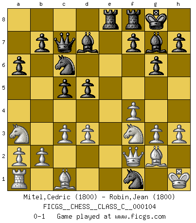 Last move : 0-1 2009 February 1 12:39:52 [Event "FICGS__CHESS__CLASS_C__000104"] [Site "FICGS"] [Date "2009.01.06"] [Round "1"] [White "Mitel,Cedric"] [Black "Robin,Jean"] [Result "0-1"] [WhiteElo "1800"] [BlackElo "1800"] 1.f4 d6 2.Nf3 g6 3.d3 Nf6 4.g3 Bg7 5.Bg2 O-O 6.O-O c6 7.e4 Qb6+ 8.Kh1 c5 9.c3 Nc6 10.Qe2 Bd7 11.Na3 a6 12.Nc4 Qc7 13.e5 Ng4 14.exd6 exd6 15.h3 Rae8 16.Qd2 d5 17.Na3 Ne3 18.Qf2 Nxf1 0-1 Bird's Opening Kingside Castling by player Black (move 5) Kingside Castling by player White (move 6) Player Black won this chess game. Follow this game move after move (download)At this time Fischer is simply a level above all the best Chessplayers in the world. (John Jacobs) Obwohl ich vom Stil her kaum zu den Priestern der Schachkunst gezählt werde, halte ich Schach doch für eine Kunst. (Tigran Petrosjan) La señal de un Gran Maestro es su habilidad de ganar una partida rápidamente y sin dolor. (Irving Chernev) L'ordinateur a tué l'originalité. Il n'y a plus guère d'aventures sur l'échiquier. (Jacob Murray) If everyone is thinking alike, then somebody isn't thinking. (US General George S. Patton)