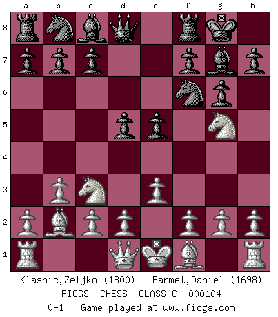 Last move : 0-1 2009 March 3 22:8:45 [Event "FICGS__CHESS__CLASS_C__000104"] [Site "FICGS"] [Date "2009.01.06"] [Round "1"] [White "Klasnic,Zeljko"] [Black "Parmet,Daniel"] [Result "0-1"] [WhiteElo "1800"] [BlackElo "1698"] 1.Nf3 Nf6 2.b3 g6 3.Bb2 Bg7 4.e3 O-O 5.Ng5 d5 6.Nc3 e5 0-1 This chess game has been lost on time (started : 2009.01.06 3:16:35) Reti Opening Kingside Castling by player Black (move 4) Player Black won this chess game. Follow this game move after move (download)The only thing Chess players have in common is Chess. (Lodewijk Prins) Ich bin Weltmeister und muß mit niemandem irgend etwas diskutieren. (Viswanathan Anand) Te sientas frente a un tablero y repentinamente tu corazón brinca. Tu mano tiembla al tomar una pieza y moverla. Pero lo que el Ajedrez te enseña es que tu debes permanecer ahí con calma y pensar de que si realmente es una buena idea o de que si hay otras ideas mejores. (Stanley Kubrick) Les sacrifices démontrent seulement que quelqu'un a gaffé. (Savielly Tartacover) Games, world of games... There's always an opponent, and there's always a victim. (Revolver, movie)