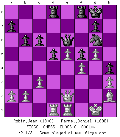 Last move : 1/2-1/2 2009 May 2 9:35:56 [Event "FICGS__CHESS__CLASS_C__000104"] [Site "FICGS"] [Date "2009.01.06"] [Round "1"] [White "Robin,Jean"] [Black "Parmet,Daniel"] [Result "1/2-1/2"] [WhiteElo "1800"] [BlackElo "1698"] 1.e4 e5 2.Nf3 Nc6 3.Bb5 Nf6 4.O-O Nxe4 5.Re1 Nd6 6.Nxe5 Be7 7.Bf1 Nxe5 8.Rxe5 O-O 9.d4 Bf6 10.Re1 Nf5 11.c3 d5 12.Bf4 Nh4 13.Bd3 Bf5 14.Bxf5 Nxf5 15.Nd2 Qd7 16.Nf3 Rae8 17.Qd3 c6 18.h3 h6 19.Ne5 Bxe5 20.dxe5 Qe6 21.Rad1 b6 22.g4 Ne7 23.Bg3 h5 24.Qe2 h4 25.Bh2 Ng6 26.f4 f5 27.g5 Rd8 1/2-1/2 Ruy Lopez : Berlin defense, Open variation Kingside Castling by player White (move 4) Kingside Castling by player Black (move 8) This chess game ended in a draw. Follow this game move after move (download)Chess teaches you to control the initial excitement you feel when you see something that looks good and it trains you to think objectively when you're in trouble. (Stanley Kubrick) Ich habe die Schachforschung dermaßen betrieben, dass sie auf eine wissenschaftliche Basis gestellt wurde. (Mikhail Moiseyevich Botvinik) ¿Cual es el objetivo de jugar una apertura de gambito?... Para adquirir una reputación de ser un jugador apuesto a costo de perder el juego. (Siegbert Tarrasch) Aucun coup ne doit être joué sans but. (Pedro Damiano) Some people are so afraid to die that they never begin to live. (Henry Van Dyke)
