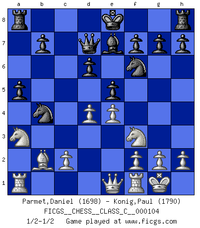 Last move : 1/2-1/2 2009 May 1 22:46:0 [Event "FICGS__CHESS__CLASS_C__000104"] [Site "FICGS"] [Date "2009.01.06"] [Round "1"] [White "Parmet,Daniel"] [Black "Konig,Paul"] [Result "1/2-1/2"] [WhiteElo "1698"] [BlackElo "1790"] 1.e4 c5 2.b4 cxb4 3.a3 bxa3 4.Nxa3 Nc6 5.Bb2 d6 6.Nf3 Nf6 7.Bd3 e5 8.O-O Nb4 9.Bb5+ Bd7 10.Bxd7+ Qxd7 11.d4 Be7 12.Qe1 a5 1/2-1/2 Sicilian : wing gambit, Carlsbad variation Kingside Castling by player White (move 8) This chess game ended in a draw. Follow this game move after move (download)We must make sure that Chess will not be like a dead language, very interesting, but for a very small group. (Sytze Faber) Frage: Was machen Sie mit den Preisen? Anwort: Ich habe Angst, dass meine Freundin davon neue Kleider kauft. (Loek van Wely) El Ajedrez es despiadado: debes de estar preparado para matar gente. (Nigel Short) Les erreurs sont comme les malheurs, elles n'arrivent jamais seules. (Siegbert Tarrasch) But they are useless. They can only give you answers. (Pablo Picasso, about computers)