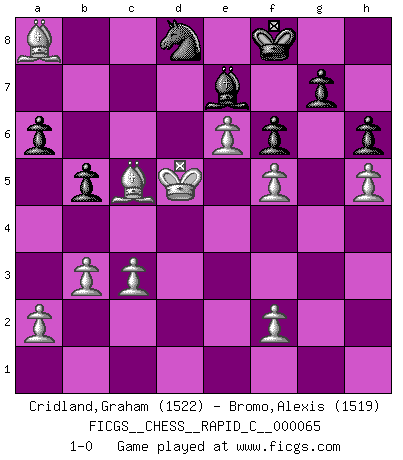 Last move : 1-0 2009 February 1 6:44:21 [Event "FICGS__CHESS__RAPID_C__000065"] [Site "FICGS"] [Date "2009.01.06"] [Round "1"] [White "Cridland,Graham"] [Black "Bromo,Alexis"] [Result "1-0"] [WhiteElo "1522"] [BlackElo "1519"] 1.e4 e5 2.Nf3 Nc6 3.Bb5 d6 4.O-O Nf6 5.Re1 a6 6.Ba4 b5 7.Bb3 h6 8.c3 Bb7 9.d4 Be7 10.Nbd2 O-O 11.Nf1 d5 12.exd5 Nxd5 13.dxe5 Na5 14.Bc2 c6 15.Ne3 Nxe3 16.Bxe3 Qxd1 17.Raxd1 Rfd8 18.b3 c5 19.Rxd8+ Rxd8 20.Rd1 Bxf3 21.gxf3 Nc6 22.Rxd8+ Bxd8 23.f4 Be7 24.Be4 Nd8 25.f5 Kf8 26.Kg2 f6 27.e6 Kg8 28.Kf3 Kh7 29.Kg4 Kg8 30.Bd5 Kh7 31.h4 Kg8 32.h5 Kh7 33.Kf3 Kg8 34.Ke4 Kf8 35.Ba8 Kg8 36.Kd5 Kf8 37.Bxc5 1-0 Ruy Lopez : Old Steinitz defense Kingside Castling by player White (move 4) Kingside Castling by player Black (move 10) Player White won this chess game. Follow this game move after move (download)The isolated Pawn casts gloom over the entire chessboard. (Aaron Nimzovich) Das Blackmar-Diemer-Gambit verändert den ganzen Menschen! (Emil Joseph Diemer) Realmente no sabemos como el juego fue inventado, aunque hay sospechas. Tan pronto como descubramos a los culpables, se los haremos saber. (Bruce Pandolfini) Des points faibles ou des trous dans la position de l'adversaire doivent être occupés par des pièces et non pas par des pions. (Siegbert Tarrasch) Every man's memory is his private literature. (Aldous Huxley)