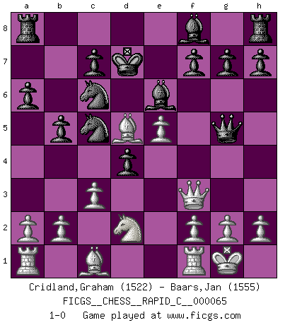 Last move : 1-0 2009 February 12 10:39:2 [Event "FICGS__CHESS__RAPID_C__000065"] [Site "FICGS"] [Date "2009.01.06"] [Round "1"] [White "Cridland,Graham"] [Black "Baars,Jan"] [Result "1-0"] [WhiteElo "1522"] [BlackElo "1555"] 1.e4 e5 2.Nf3 Nc6 3.Bb5 a6 4.Ba4 Nf6 5.O-O b5 6.Bb3 Nxe4 7.d4 d5 8.dxe5 Be6 9.Nbd2 Nc5 10.c3 d4 11.Ng5 Qxg5 12.Qf3 Kd7 13.Bd5 1-0 Ruy Lopez : 5.O-O Kingside Castling by player White (move 5) Player White won this chess game. Follow this game move after move (download)With or without the title, Bobby Fischer was unquestionably the greatest player of his time. (Burt Hochberg) Schach ist eine Sache der genauen Beurteilung, wann man zuschlagen und wann man sich ducken muss. (Robert James Fischer) ¿Esta Bobby Fischer algo cuerdo?. (Salo Flohr) Karpov est une pièce de musée. (Garry Kasparov) Those who make the worst use of their time are the first to complain of its brevity. (Jean de la Bruyere)