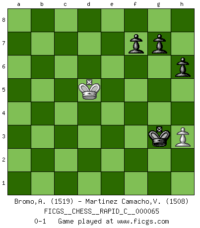 Last move : 0-1 2009 February 17 19:17:55 [Event "FICGS__CHESS__RAPID_C__000065"] [Site "FICGS"] [Date "2009.01.06"] [Round "1"] [White "Bromo,Alexis"] [Black "Martinez Camacho,Victor Hugo"] [Result "0-1"] [WhiteElo "1519"] [BlackElo "1508"] 1.e4 c6 2.Nf3 d5 3.exd5 cxd5 4.d4 Bg4 5.Be2 e6 6.Nc3 Bd6 7.h3 Bxf3 8.Bxf3 Nf6 9.O-O O-O 10.Re1 Nc6 11.Bg5 h6 12.Bxf6 Qxf6 13.a3 Qxd4 14.Qxd4 Nxd4 15.Rac1 Nxf3+ 16.gxf3 Rac8 17.Ne2 Rc4 18.b4 Rh4 19.Kg2 Rc8 20.c3 Be5 21.Nd4 Bxd4 22.cxd4 Rxc1 23.Rxc1 Rxd4 24.Rc7 Rd3 25.a4 Ra3 26.Rxb7 Rxa4 27.b5 Rb4 28.Rxa7 Rxb5 29.Ra8+ Kh7 30.Rf8 Kg6 31.Kg3 d4 32.Rd8 Rd5 33.Rxd5 exd5 34.f4 Kf5 35.Kf3 d3 36.Ke3 d2 37.Kxd2 Kxf4 38.Kd3 Kf3 39.Kd4 Kxf2 40.Kxd5 Kg3 0-1 Caro-Kann defense Kingside Castling by player White (move 9) Kingside Castling by player Black (move 9) 10 pieces endgame at move 33 : White KPPP , Black KPPPPP WHITE : King + 3 Pawns BLACK : King + 5 Pawns 9 pieces endgame at move 37 : White KPPP , Black KPPPP WHITE : King + 3 Pawns BLACK : King + 4 Pawns 8 pieces endgame at move 37 : White KPP , Black KPPPP WHITE : King + 2 Pawns BLACK : King + 4 Pawns 7 pieces endgame at move 39 : White KP , Black KPPPP WHITE : King + 1 Pawn BLACK : King + 4 Pawns 6 pieces endgame at move 40 : White KP , Black KPPP WHITE : King + 1 Pawn BLACK : King + 3 Pawns Player Black won this chess game. Follow this game move after move (download)Why must I lose to this idiot ? (Aron Nimzovich) Mutter, ich bin eben Ex-Weltmeister geworden. --beim nach Hause Kommen nach dem Verlust des WM-Titels an Mihail Botvinnik -- (Mikhail Nekhemyevich Tal) Yo he agregado estos principios a la ley: pongan los Caballos en acción antes de que los dos Alfiles sean desarrollados. (Emanuel Lasker) Psychologiquement, tu dois avoir confiance en toi même, mais cette confiance doit être basée sur des faits. (Robert Fischer) Faith : not wanting to know what is true. (Friedrich Nietzsche)