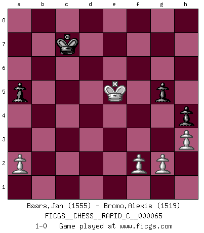Last move : 1-0 2009 February 15 15:23:0 [Event "FICGS__CHESS__RAPID_C__000065"] [Site "FICGS"] [Date "2009.01.06"] [Round "1"] [White "Baars,Jan"] [Black "Bromo,Alexis"] [Result "1-0"] [WhiteElo "1555"] [BlackElo "1519"] 1.e4 c5 2.Nf3 d6 3.d4 cxd4 4.Nxd4 Nc6 5.Nc3 e5 6.Ndb5 a6 7.Na3 Nf6 8.Bg5 Be7 9.Bxf6 Bxf6 10.Nd5 O-O 11.c3 Be6 12.Ne3 Qc7 13.Nd5 Bxd5 14.Qxd5 Rad8 15.Be2 Ne7 16.Qc4 Qxc4 17.Bxc4 d5 18.exd5 Nxd5 19.Bxd5 Rxd5 20.Rd1 Rfd8 21.Rxd5 Rxd5 22.Ke2 Bg5 23.Rd1 Rxd1 24.Kxd1 b6 25.Nc4 Bd8 26.Nxe5 f6 27.Nf3 Kf7 28.Kd2 Ke6 29.Kd3 Bc7 30.c4 g5 31.h3 h5 32.Ke4 Be5 33.Nxe5 fxe5 34.b4 h4 35.c5 bxc5 36.bxc5 a5 37.c6 Kd6 38.c7 Kxc7 39.Kxe5 1-0 Sicilian Kingside Castling by player Black (move 10) 10 pieces endgame at move 38 : White KPPPP , Black KPPPP WHITE : King + 4 Pawns BLACK : King + 4 Pawns 9 pieces endgame at move 39 : White KPPPP , Black KPPP WHITE : King + 4 Pawns BLACK : King + 3 Pawns Player White won this chess game. Follow this game move after move (download)You have to have the fighting spirit. You have to force moves and take chances. (Bobby Fischer) Die größte Kunst beim Schach besteht darin dem Gegner nicht zu zeigen was er tun kann. (Garry Kasparov) Preferería tener un Peón que un dedo. (Reuben Fine) Dans le domaine de la peinture, de la gravure et de la sculpture, dès la première décennie de notre siècle, les artistes abandonnent la représentation de la partie d'échecs pour se concentrer sur les pièces, sur les échiquiers et sur toutes les variations auxquelles les unes et les autres peuvent donner lieu. On passe en quelque sorte d'un thème social à un thème musical (au sens de la musica médiévale, c'est-à-dire d'une notion qui inclue le rythme, l'harmonie, la construction et la déconstruction, etc.). Graphiquement et picturalement, l'échiquier apparaît comme une structure ouverte, dynamique, d'une richesse infinie, autorisant toutes les combinatoires et débouchant sur des mouvements et des rythmes de nature exponentielle. (Michel Pastoureau) Macintosh - we might not get everything right, but at least we knew the century was going to end. (Douglas Adams)