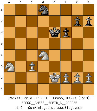 Last move : 1-0 2009 January 25 20:39:12 [Event "FICGS__CHESS__RAPID_C__000065"] [Site "FICGS"] [Date "2009.01.06"] [Round "1"] [White "Parmet,Daniel"] [Black "Bromo,Alexis"] [Result "1-0"] [WhiteElo "1698"] [BlackElo "1519"] 1.e4 c5 2.b4 cxb4 3.a3 Nc6 4.axb4 Nxb4 5.c3 Nc6 6.d4 d5 7.Bb5 Bd7 8.exd5 Nxd4 9.Bxd7+ Qxd7 10.Qxd4 Nf6 11.Rxa7 Rxa7 12.Qxa7 Nxd5 13.Qb8+ Qd8 14.Qxb7 e5 15.Qb5+ Qd7 16.Qb8+ Qd8 17.Qxe5+ Ne7 18.Nf3 f6 19.Qb5+ Qd7 20.Qxd7+ Kxd7 21.Ke2 Nc6 22.Rd1+ Ke6 23.Ba3 Bxa3 24.Nxa3 Rd8 25.Rxd8 Nxd8 26.Nd4+ 1-0 Sicilian : wing gambit, Marshall variation Player White won this chess game. Follow this game move after move (download)When I asked Fischer why he had not played a certain move in our game, he replied: 'Well, you laughed when I wrote it down !' (Mikhail Tal) Ich war schon mal beim Dopingtest. Da musste ich Urin abgeben, während Dritte zusahen. (Elisabeth Pähtz) El Ajedrez es una guerra en un tablero. El objetivo es aplastar la mente del oponente. (Bobby Fischer) Les échecs, c'est l'imagination. (David Bronstein) Treat your password like your toothbrush. Don't let anybody else use it, and get a new one every six months. (Clifford Stoll)