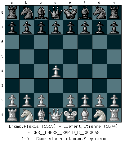 Last move : 1-0 2009 February 6 20:40:20 [Event "FICGS__CHESS__RAPID_C__000065"] [Site "FICGS"] [Date "2009.01.06"] [Round "1"] [White "Bromo,Alexis"] [Black "Clement,Etienne"] [Result "1-0"] [WhiteElo "1519"] [BlackElo "1674"] 1.d4 1-0 This chess game has been lost on time (started : 2009.01.06 22:59:22) Queen's pawn Player White won this chess game. Follow this game move after move (download)Live, lose, and learn, by observing your opponent how to win. (Amber Steenbock) Schach ist mein Leben, meine Leidenschaft, was ich gelernt habe und seit meinem 14. Lebensjahr profimässig praktiziere. Darauf zu verzichten, würde mir sehr schwer fallen. (Viktor Kortschnoi) Cuando le juegas a Fischer, no es una cuestion de si vas a ganar o perder. Es una cuestion de si vas a sobrevivir. (Boris Spassky) Je crois qu'il existe des manières très spécifiques de jouer efficacement contre une machine. Evidemment, nous n'avons aucune chance en technique pure, parce que l'ordinateur calcule de manière parfaite. Mais lorsque nous faisons appel à notre cerveau, en utilisant l'intuition et la compréhension, alors nous restons beaucoup plus forts. (Anatoli Karpov) 'preceded by its own quotation yields a falsehood' preceded by its own quotation yields a falsehood. (W. V. O. Quine - Set Theory And Its Logic, 1953)