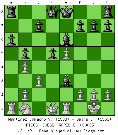 Last move : 1/2-1/2 2009 February 26 17:15:42 [Event "FICGS__CHESS__RAPID_C__000065"] [Site "FICGS"] [Date "2009.01.06"] [Round "1"] [White "Martinez Camacho,Victor Hugo"] [Black "Baars,Jan"] [Result "1/2-1/2"] [WhiteElo "1508"] [BlackElo "1555"] 1.e4 e5 2.Nf3 Nc6 3.Bb5 a6 4.Ba4 Nf6 5.O-O b5 6.Bb3 Nxe4 7.Re1 d5 8.d4 Be6 9.Nxe5 Nxe5 10.dxe5 Nc5 11.c3 Nxb3 12.axb3 Bc5 13.b4 Bb6 14.Be3 Bxe3 1/2-1/2 Ruy Lopez : 5.O-O Kingside Castling by player White (move 5) This chess game ended in a draw. Follow this game move after move (download)Combinations have always been the most intriguing aspect of Chess. The masters look for them, the public applauds them, the critics praise them. It is because combinations are possible that Chess is more than a lifeless mathematical exercise. They are the poetry of the game; they are to Chess what melody is to music. They represent the triumph of mind over matter. (Reuben Fine) Oft bringt ein stiller Zug das Erdbeben. (Richard Reti) Uno no tiene que jugar muy bien, es suficiente jugar mejor que el oponente. (Siegbert Tarrasch) Ce n'est pas pour s'amuser qu'il joue aux échecs : il célèbre un culte. (Vladimir Nabokov) Wisdom doesn't necessarily come with age. Sometimes age just shows up all by itself. (Tom Watson)