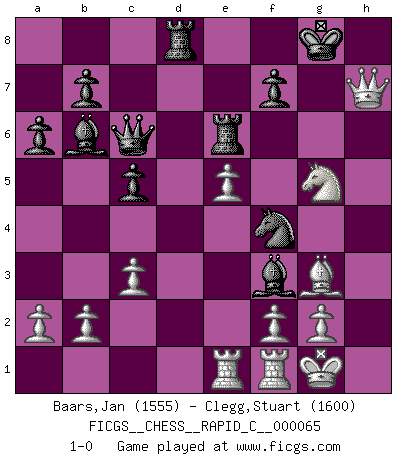Last move : 1-0 2009 February 11 22:56:26 [Event "FICGS__CHESS__RAPID_C__000065"] [Site "FICGS"] [Date "2009.01.06"] [Round "1"] [White "Baars,Jan"] [Black "Clegg,Stuart"] [Result "1-0"] [WhiteElo "1555"] [BlackElo "1600"] 1.e4 e5 2.Nf3 Nc6 3.Bb5 a6 4.Ba4 Nf6 5.O-O Bc5 6.d3 O-O 7.Bxc6 dxc6 8.Nxe5 Re8 9.Nf3 Bg4 10.Bg5 h6 11.Bh4 g5 12.Bg3 Bb6 13.Nbd2 Nd7 14.Qc1 Qf6 15.c3 Nc5 16.Qc2 Ne6 17.d4 Nf4 18.Rae1 Rad8 19.h4 c5 20.hxg5 hxg5 21.d5 c6 22.e5 Qh6 23.dxc6 Qxc6 24.Ne4 Re6 25.Nexg5 Bxf3 26.Qh7+ 1-0 Ruy Lopez : Moeller defense Kingside Castling by player White (move 5) Kingside Castling by player Black (move 6) Player White won this chess game. Follow this game move after move (download)The game of chess is the touchstone of the intellect. (Goethe) Das Schach ist nichts für kleine Geister, es beansprucht einen vollen Mann, der sich nicht sklavisch an das Überlieferte hält, sondern selbständig die Tiefen des Spiels zu ergründen sucht. (Wilhelm Steinitz) Yo siempre he tenido un ligero sentimiento de lástima por una persona que no tiene conocimiento del Ajedrez. (Siegbert Tarrasch) Avec des compensations pour le matériel en plus... (Anonyme) A belief is an idea the mind possesses, an idea that possesses the mind. (Robert Oxden Bolton)