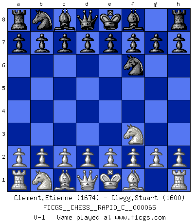 Last move : 0-1 2009 February 7 20:46:52 [Event "FICGS__CHESS__RAPID_C__000065"] [Site "FICGS"] [Date "2009.01.06"] [Round "1"] [White "Clement,Etienne"] [Black "Clegg,Stuart"] [Result "0-1"] [WhiteElo "1674"] [BlackElo "1600"] 1.Nf3 Nf6 0-1 This chess game has been lost on time (started : 2009.01.06 22:59:22) Reti Opening Player Black won this chess game. Follow this game move after move (download)There must have been a time when men were demigods, or they could not have invented Chess. (Gustav Schenk) Jeder leidlich begabte Spieler, er braucht keineswegs hervorragend veranlagt zu sein, kann es zum Meister bringen. Aber das ist ja auch gar nicht nötig! Der richtige Standpunkt ist es, zu seinem Vergnügen zu spielen, und man glaube ja nicht, dass der Genuss proportional dem Können sei. (Siegbert Tarrasch) Yo nunca en mi vida he jugado la Defensa Francesa, que viene siendo la más aburrida de todas las Aperturas. (Wilhelm Steinitz) Le moment que je préfère le plus dans une rencontre, c'est celui où je sens que la personnalité de l'adversaire se brise. (Robert Fischer) Empty your mind, be formless, shapeless — like water. (Bruce Lee)