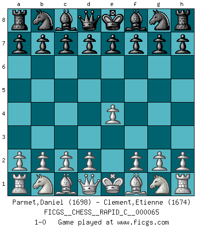 Last move : 1-0 2009 February 6 20:40:20 [Event "FICGS__CHESS__RAPID_C__000065"] [Site "FICGS"] [Date "2009.01.06"] [Round "1"] [White "Parmet,Daniel"] [Black "Clement,Etienne"] [Result "1-0"] [WhiteElo "1698"] [BlackElo "1674"] 1.e4 1-0 This chess game has been lost on time (started : 2009.01.06 22:59:22) King's pawn Opening Player White won this chess game. Follow this game move after move (download)In a gambit you give up a Pawn for the sake of getting a lost game. (Samuel Standige Boden) Es ist wirklich schade, dass so viele Schachspieler nicht auf ihr Äußeres achten! (Alexandra Kosteniuk) El Ajedrez es una manera fabulosa para que los niños aprendan a autovalorarse y a autoestimarse. (Saudin Robovic) Aux échecs, les retours au sommet sont rares : les dommages psychologiques consécutifs à une défaite sont trop sévères. (Daily Telegraph) The existence of forgetting has never been proved: We only know that some things don't come to mind when we want them. (Friedrich Nietzsche)