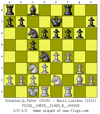 Last move : 1/2-1/2 2006 April 27 9:49:0 [Event "FICGS__CHESS__CLASS_B__000002"] [Site "FICGS"] [Date "2006.04.16"] [Round "1"] [White "Schalkwijk,Peter"] [Black "Nucci,Luciano"] [Result "1/2-1/2"] [WhiteElo "2015"] [BlackElo "2101"] 1.e4 c5 2.Nc3 d6 3.g3 Nc6 4.Bg2 g6 5.d3 Bg7 6.Be3 e6 7.Qd2 Nge7 8.Bh6 Bxh6 9.Qxh6 Nd4 10.O-O-O Nec6 11.Qg7 Ke7 12.Nge2 Qf8 13.Qxf8+ Rxf8 14.f4 f6 15.Rhf1 1/2-1/2 Sicilian : Closed Queenside Castling by player White (move 10) This chess game ended in a draw. Follow this game move after move (download)What is the object of playing a gambit opening?... To acquire a reputation of being a dashing player at the cost of losing a game. (Siegbert Tarrasch) Immer nach dem besten Zug zu suchen ist ziemlich unpraktisch. (Nigel Short) Buenas posiciones no logran ganar juegos, buenas movidas sí. (Gerald Abrahams) Seul un grand joueur sait à quel point il joue faiblement. (Xavier Tartacover) We need strong personalities and only one world champion to attract sponsors. (Anatoly Karpov)