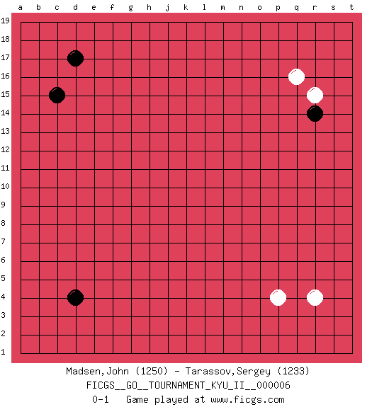 Last move : 0-1 2009 February 11 21:1:40 [Event "FICGS__GO__TOURNAMENT_KYU_II__000006"] [Site "FICGS"] [Date "2009.01.07"] [Round "1"] [Black "Madsen,John"] [White "Tarassov,Sergey"] [Result "0-1"] [Rating 1 "1250"] [Rating 2 "1233"] 1.d17 r4 2.d4 q16 3.c15 p4 4.r14 r15 0-1 This go game has been lost on time (started : 2009.01.07 2:30:7) Here are the names of the openings (joseki) played in the four corners : Corner q16 : q16 r14 Hoshi (Hwajeom, Seongjeom, Xingwei`) 4-4 Point. The star or hoshi (4-4) point, emphasizing influence at the potential expense of territory. Ikken Kakari (Hankan Keolch'im, Yi Gua`jiao~, 1-Space Low Approach). Black 2 is the standard approach move to the 4-4. Player White won this Go (weiqi, baduk) game. Follow this game move after move (download)If you don't know ladders, don't play go. (Anonymous) A proverb is a short sentence based on long experience. (Miguel de Cervantes)